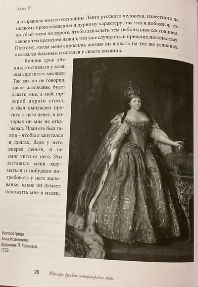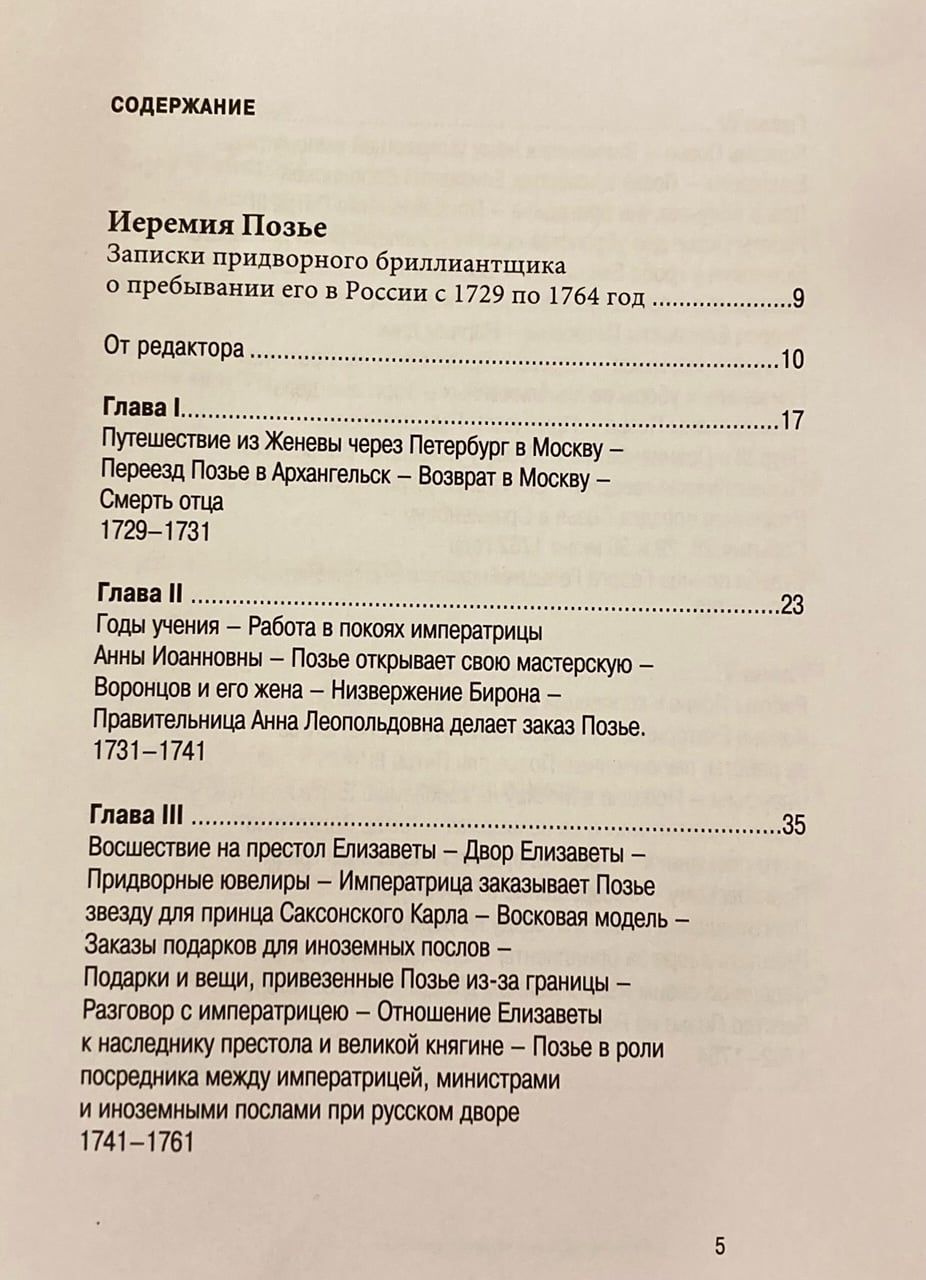 The first part includes the memoirs of the famous diamondsmith I. Pozier (1716-1779) about his stay in Russia from 1729 to 1764. The master's work had a great influence on Russian and European jewelry art.