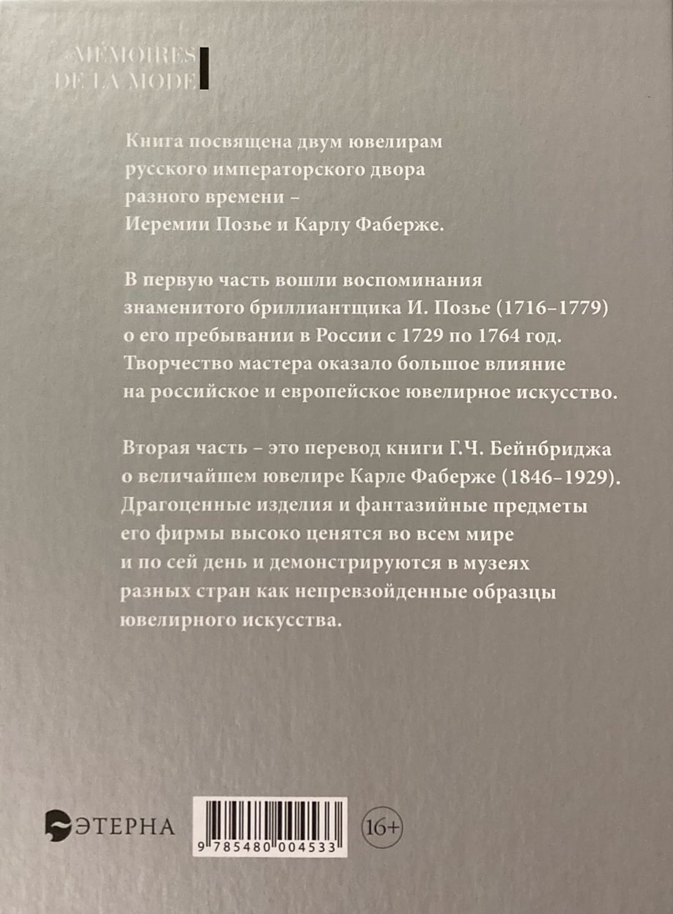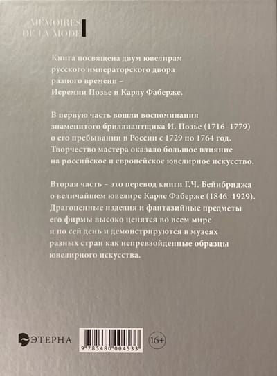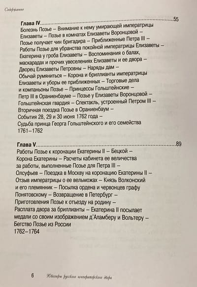 The book is dedicated to two jewelers of the Russian imperial court of different times - Jeremiah Pozier and Carl Faberge.