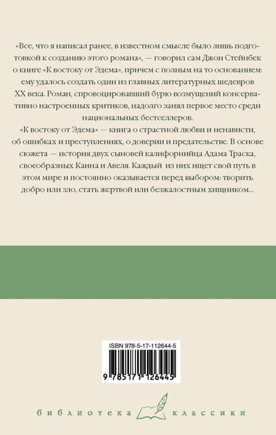 "All that I have written before, in a sense, was only a preparation for the creation of this novel" - said John Steinbeck himself about the book "East of Eden", and with good reason: he managed to create one of the major literary masterpieces of the twentieth century. The novel, which provoked a storm of indignation of conservative critics, for a long time took the first place among the national bestsellers. "East of Eden" - a book about passionate love and hate, about mistakes and crimes, about trust and betrayal. At the heart of the plot - the story of two sons of Californian Adam Trask, a kind of Cain and Abel. Each of them is looking for his own way in this world and is constantly faced with a choice: to do good or evil, to become a victim or a ruthless predator....