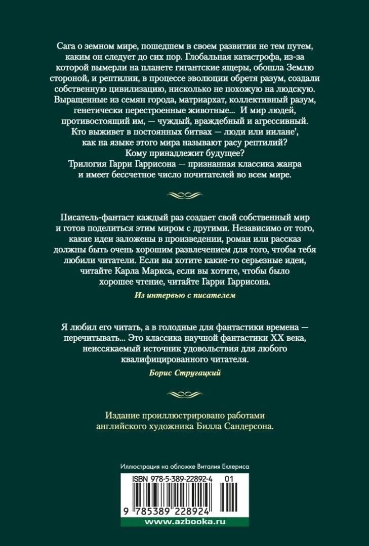 A saga about the Earth world, which has taken a different path in its development than it has followed so far. The global catastrophe that made the planet's giant lizards extinct bypassed the Earth, and the reptiles, in the process of evolution having acquired reason, created their own civilization, not at all similar to the human one. Cities grown from seeds, matriarchy, collective intelligence, genetically rearranged animals... And the human world opposing them is alien, hostile and aggressive. Who will survive the constant battles - humans or the Iilans', as the reptilian race is called in the language of this world? To whom does the future belong? Harry Harrison's trilogy is a recognized classic of the genre and has countless admirers around the world. The edition is illustrated with artwork by British artist Bill Sanderson.