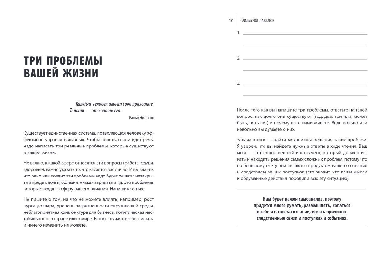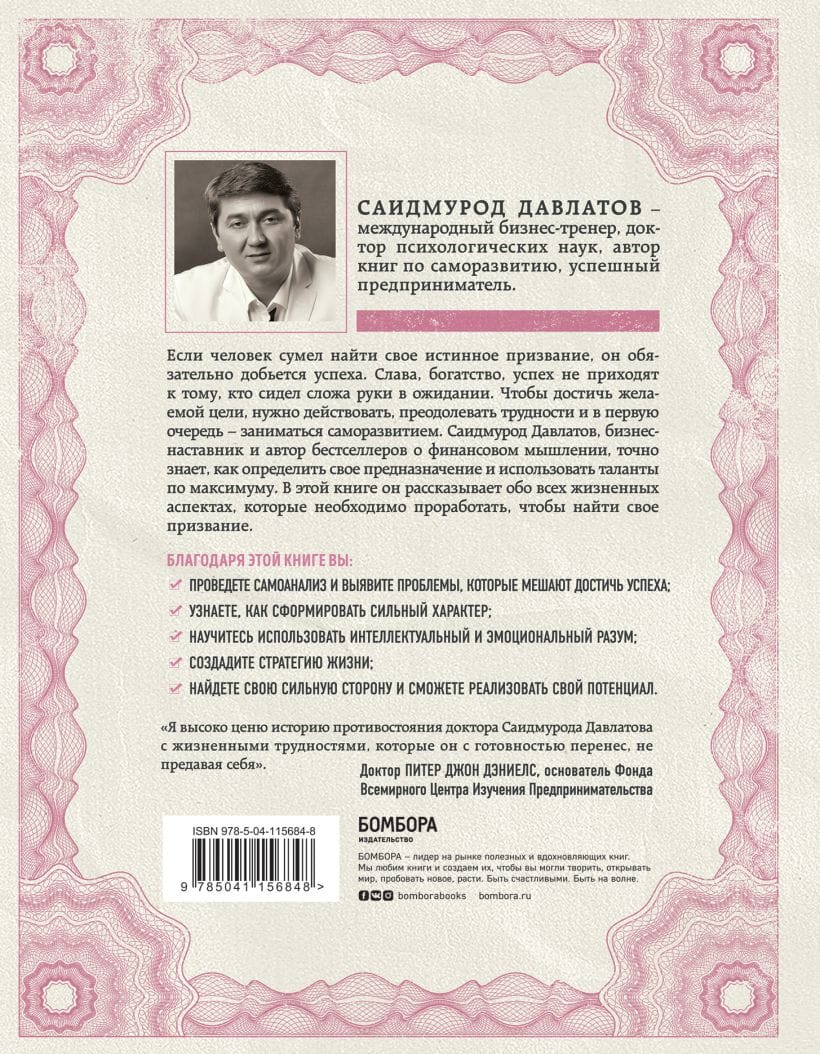 If a person has managed to find his true calling, he will definitely achieve success. Fame, wealth, success do not come to those who sit idly by and wait. To achieve the desired goal, you need to act, overcome difficulties and, first of all, engage in self-development. Saidmurod Davlatov, a business mentor and bestselling author of financial thinking, knows exactly how to determine your purpose and use your talents to the maximum. In this book, he talks about all the aspects of life that need to be worked out in order to find your calling.
