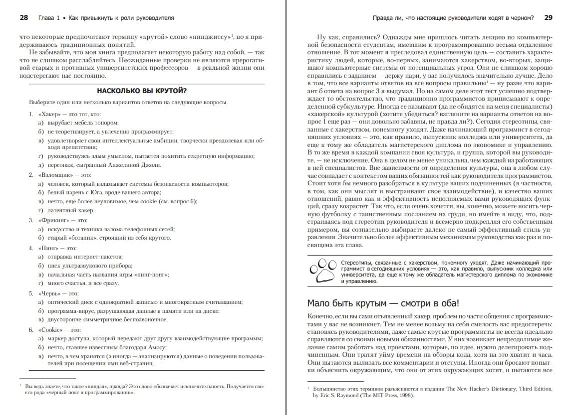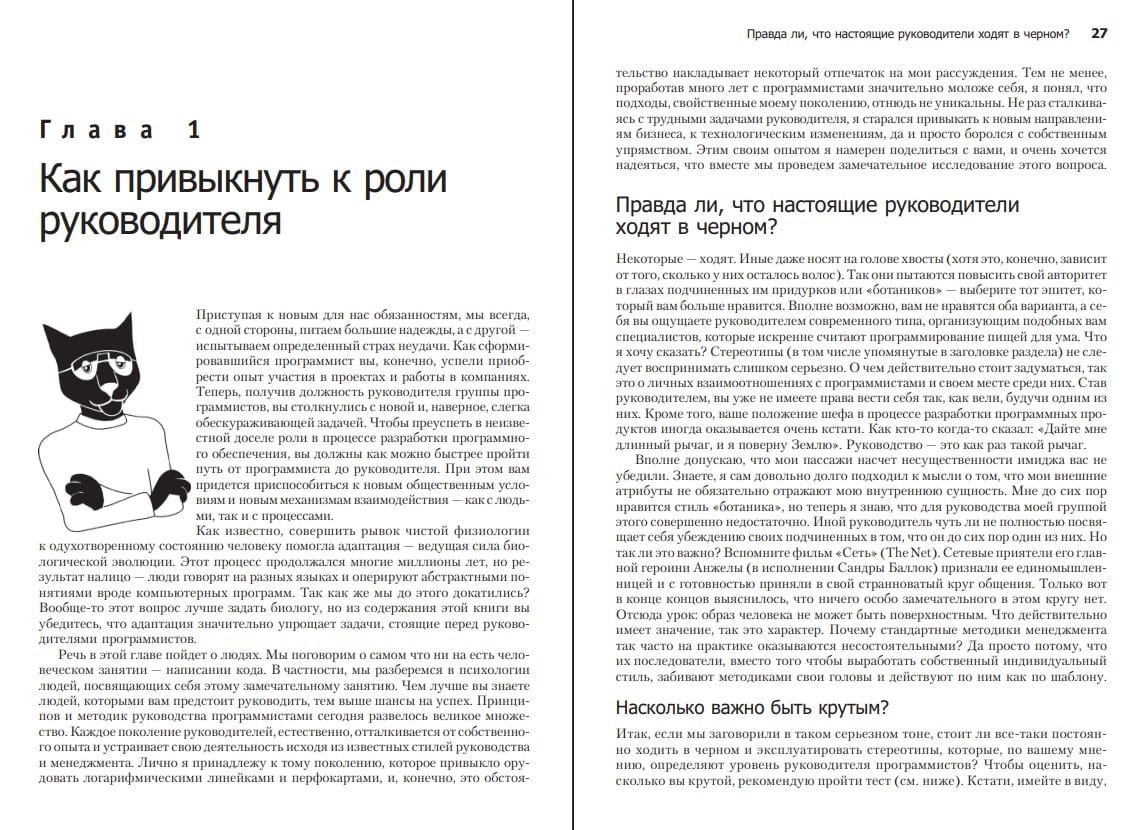 "The Art of Cat Herding" is a book about leadership and management, and how to combine the two. It's a dictionary, if you will, of difficult IT project management situations. A programmer is like a cat who walks alone. That's just the way it is. That's why leading a team of programmers is so challenging. Even if you were a brilliant and disciplined programmer just a month ago and suddenly find yourself in a managerial role, you probably don't know where to start, what leadership style to choose, how to hire and fire employees, conduct meetings, and ensure timely completion of tasks. In that case, you can't do without this book. Or perhaps you're an experienced manager looking to rethink your leadership principles? Then, again, this book is for you. Regardless of age, gender, or social status, it will help you strengthen your position as a programmer leader. The material is presented quite concisely and is easy to digest. When you're standing in a bookstore wondering what to buy, ask yourself one simple question: "Do I need to improve my leadership skills?" I'm guessing the answer is "Yes," which means my book will be useful to you.