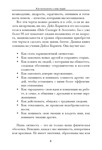 There are some people who are attracted to themselves as if by a magnet. They don't need to ask anyone for anything - everyone is happy to offer them help. They are able to bend anyone to their point of view without saying a word. They enjoy immense popularity, their career takes off at breakneck speed, and life is like a holiday. Do you want to become the same? It is possible! Dale Carnegie's new book will teach you how to dispose of people, win new friends and keep old ones, influence other people's opinions, make others trust and establish effective relationships with even the most conflicted people.