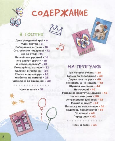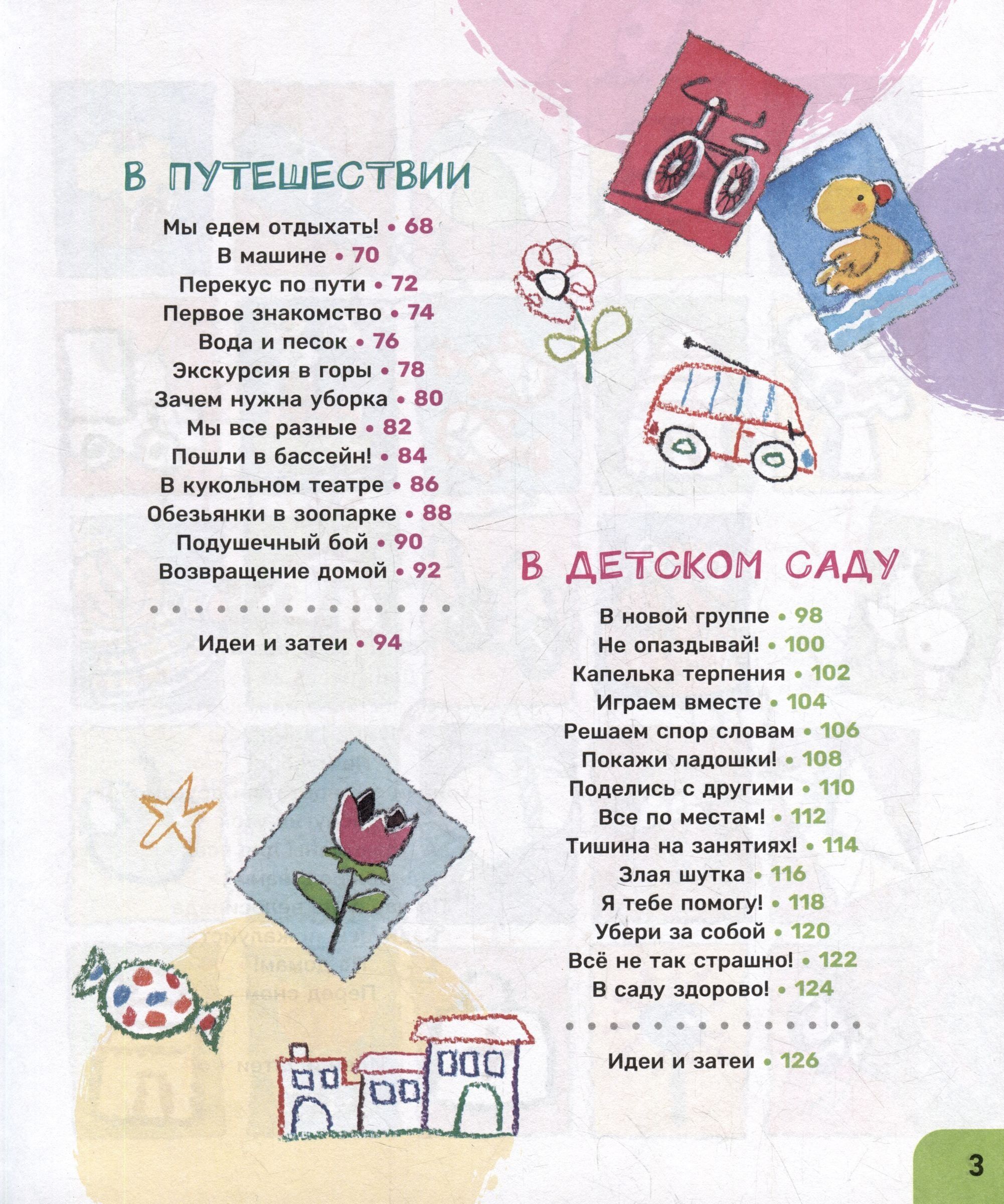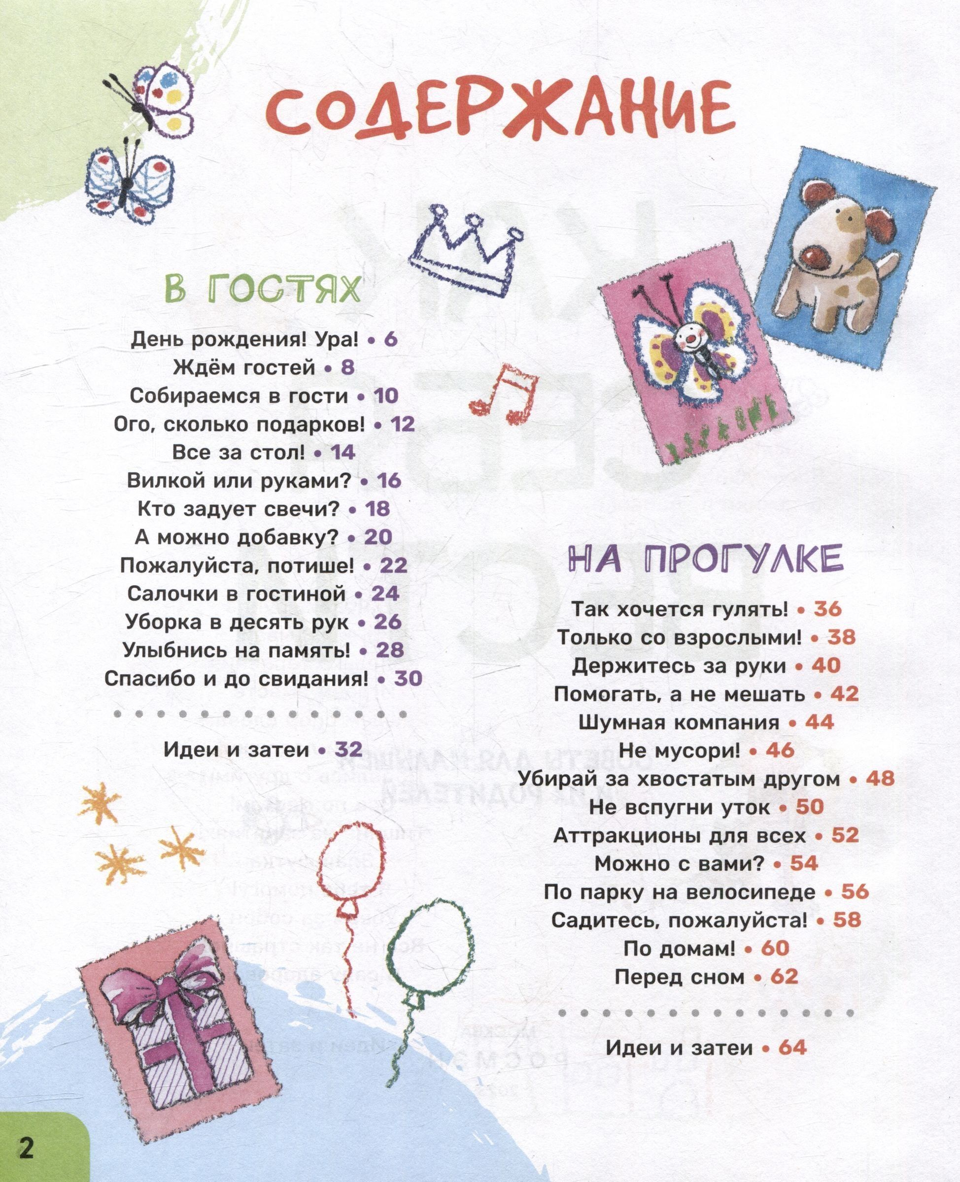 Watching the characters, the baby: - will learn how to behave in this or that case; - will learn basic etiquette and precautions; - will begin to understand the peculiarities of behavior of other children. Each spread contains questions for children and advice for adults, as well as topics for further discussion with the child about difficult situations. A special "Ideas and Activities" section at the end of each chapter is devoted to games, activities, and simple recipes that children can prepare with the help of adults.