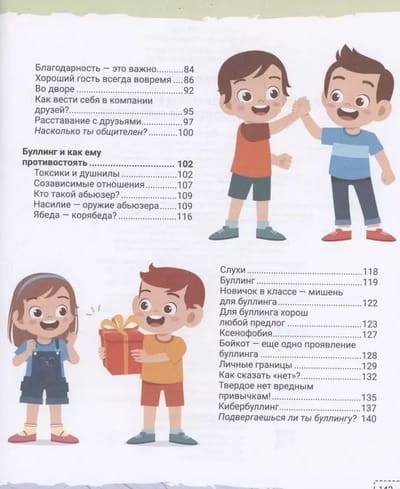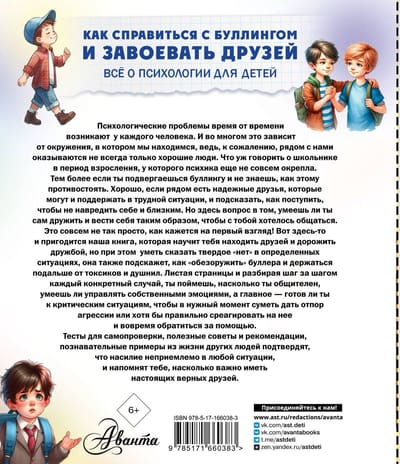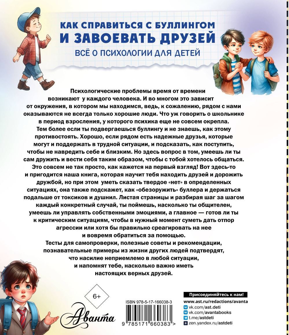Bullying is when someone hurts others with words or actions. It can happen at school, on the street, or even at home. The most important thing to remember is that you are not alone and, unfortunately, you are not the only person who finds themselves in this situation. How to recognize bullying? How to protect yourself and others during aggression? How to "disarm" a bully? How to avoid socializing with toxics and douchebags? How to manage your emotions? How to create a mood? How to develop willpower? How to make loyal friends? How to become a kind and compassionate person? Answers to these and many other important questions about interaction with peers and adults, you will find in this book - your guide to the world of friendship and understanding with others. Tips, exercises and tests will help you not only to cope with bullying, aggression and violence, but also to understand yourself, your emotions and learn how to win friends.