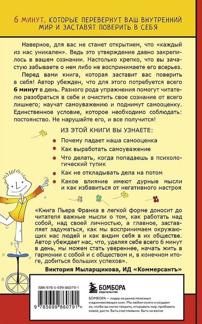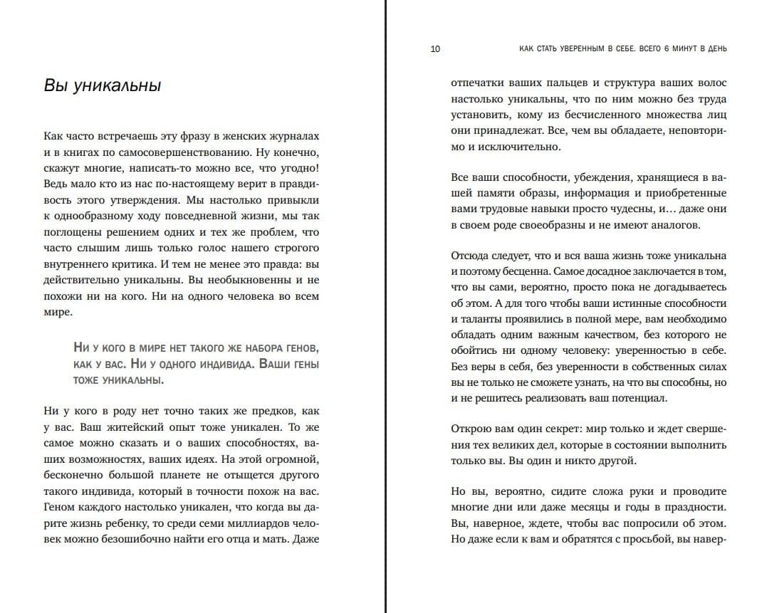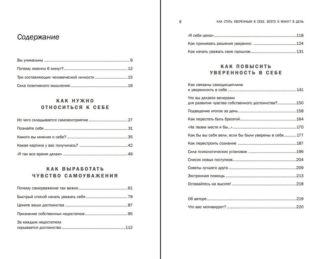 This book will teach readers how to overcome negative attitudes and develop a positive self-image; understand their weaknesses and learn to capitalize on their strengths. This book isn't just vague theory; it offers practical exercises and helpful recommendations; vivid examples and simple exercises. With just 6 minutes a day, you'll become 100% confident in yourself and your abilities.