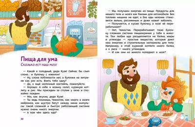 In the new encyclopedia, Chevostik and Uncle Kuzya will embark on an extraordinary journey and discover how the human brain works, what cells it consists of, how it controls the entire body, what helps it do this, which areas of the brain are responsible for important functions, and much more. Embark on a new journey with your favorite characters, and you'll learn things you never even imagined!