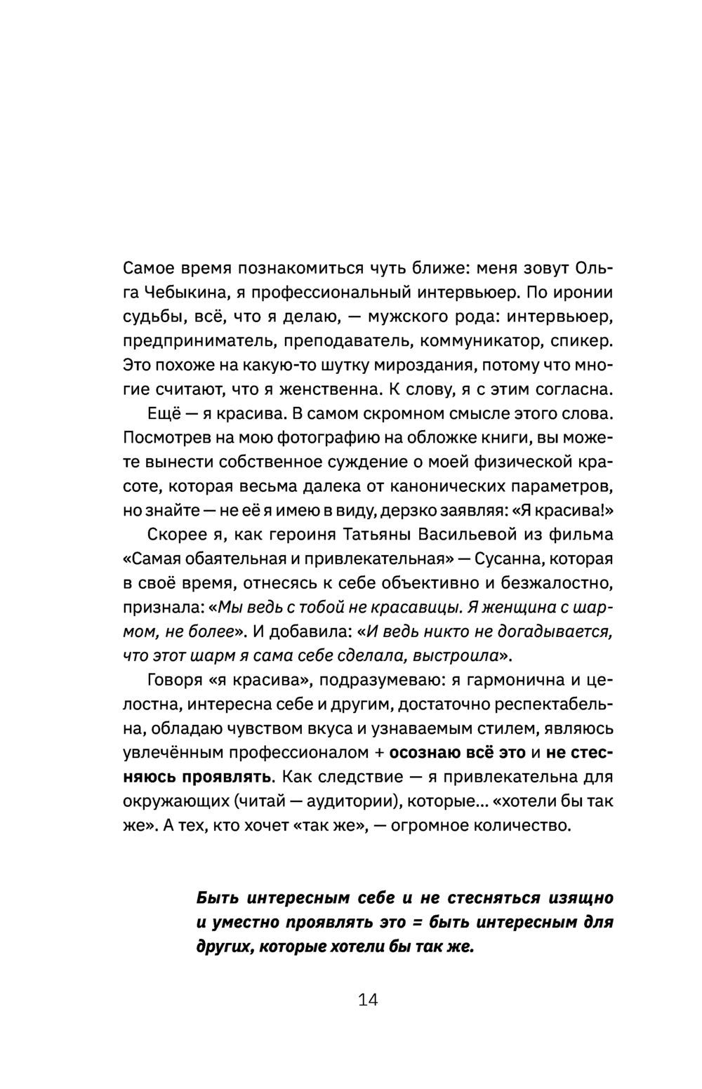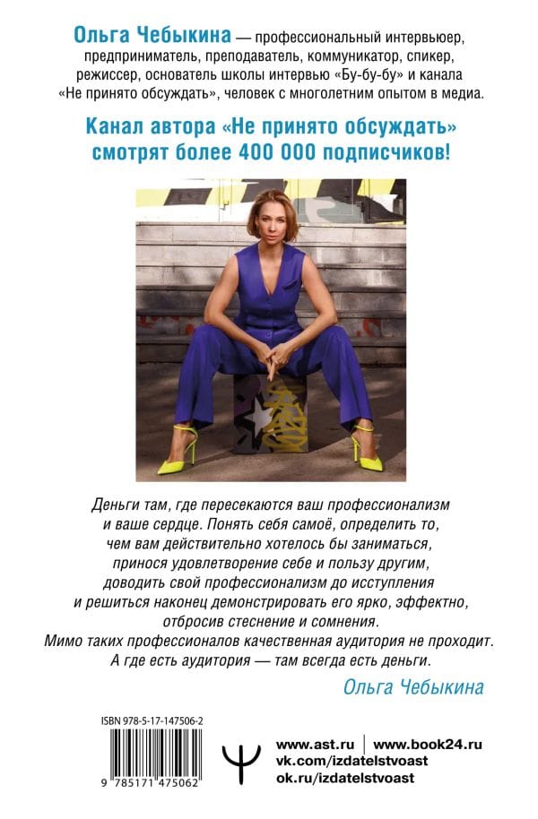 The release of the book by Olga Chebykina, a professional interviewer, entrepreneur, teacher, and owner of two silver YouTube buttons, is a real event for everyone whose career and hobbies are connected with public speaking. With vast experience in the media sphere, the author of the book shares the secret ingredients of successful public speaking. Words can not only encourage people to act, but also to earn! And even in the conditions of the changed reality. Ethers in social networks, speeches on stage, lectures, business meetings - this is only a small part of the scope of skills that you can develop under the careful guidance of the author of the book. But even if you do not connect your activity with public speaking, this book will help you get to know yourself better, identify your strengths, cope with your fears and anxieties, gain self-confidence and build effective communication with others.