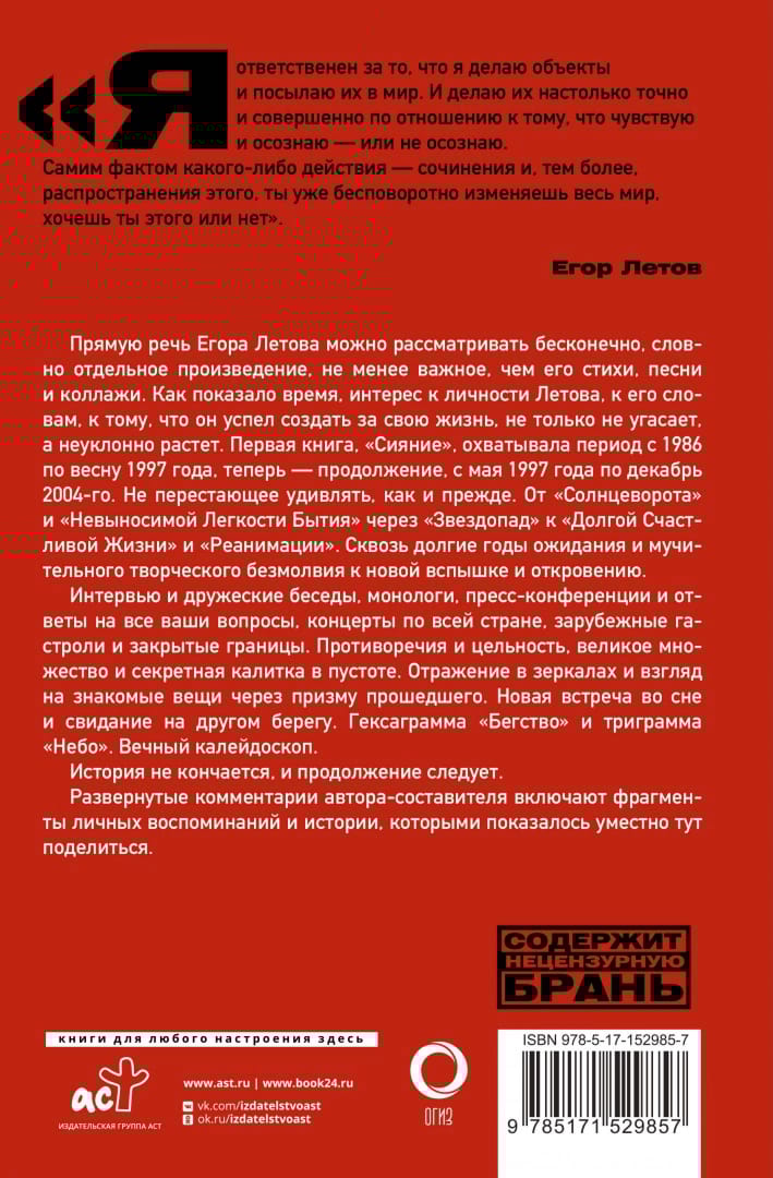 Egor Letov's direct speech can be considered endlessly, as if it were a separate work, no less important than his poems, songs and collages. As time has shown, the interest in Letov's personality, in his words, in what he managed to create during his life is not only not fading, but steadily growing. The first book, "Siyaniye", covered the period from 1986 to the spring of 1997, now - a sequel, from May 1997 to December 2004. Never ceasing to amaze, as it does. From "Sunshine" and "The Unbearable Lightness of Being" through "Starfall" to "Long Happy Life" and "Reanimation." Through long years of waiting and agonizing creative silence to a new flash and revelation. Interviews and friendly conversations, monologues, press conferences and answers to all your questions, concerts all over the country, foreign tours and closed borders. Contradictions and wholeness, the great multitude and the secret wicket in the void. Reflection in mirrors and looking at familiar things through the prism of the past. A new meeting in a dream and a date on the other shore. Hexagram "Escape" and trigram "Sky". Eternal kaleidoscope. The story does not end, and the sequel follows.