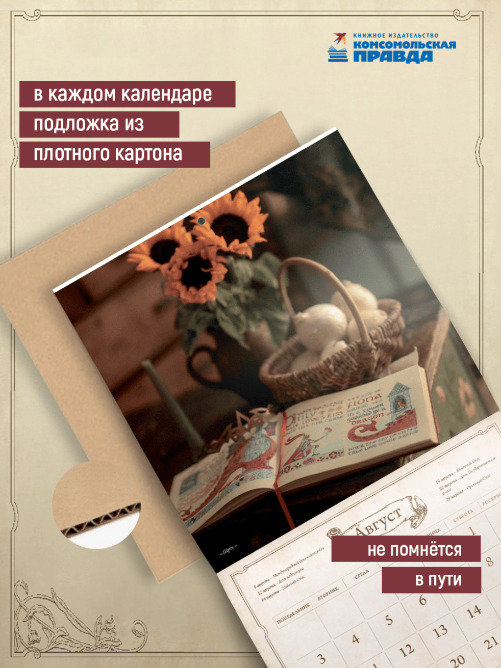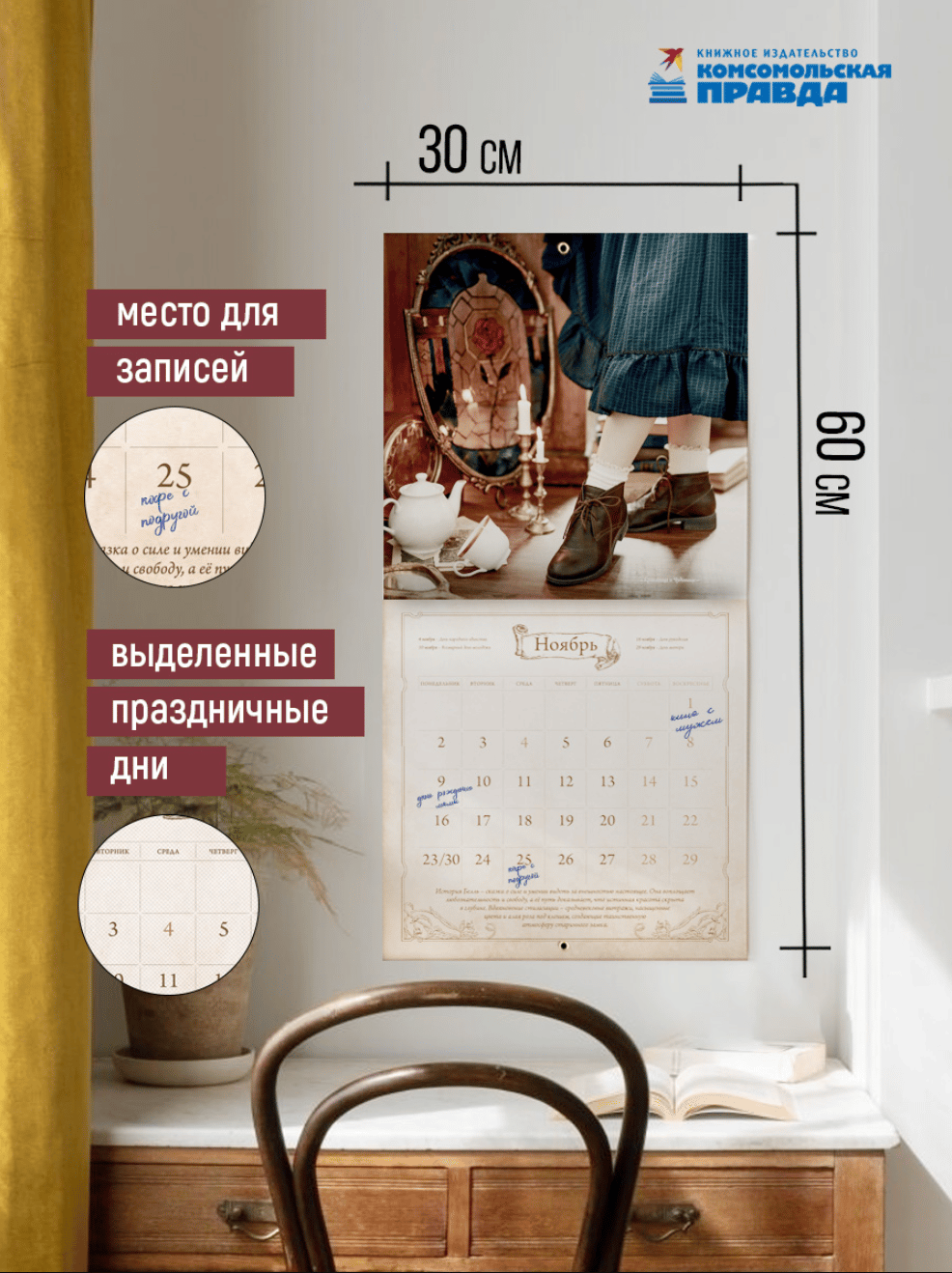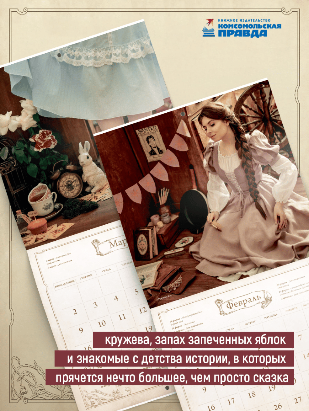 Lace, the scent of baked apples, and familiar childhood stories that hide something more than just a fairy tale. This is the mood of the year, embodied in vintage images and thought out to the smallest detail. The warm, handmade feel and recognizable themes in this calendar from Daria Levina, author of the bestsellers "The Book of Inspiration" and "The Romance of the Dacha," transform each month into a magical space you'll want to linger in.