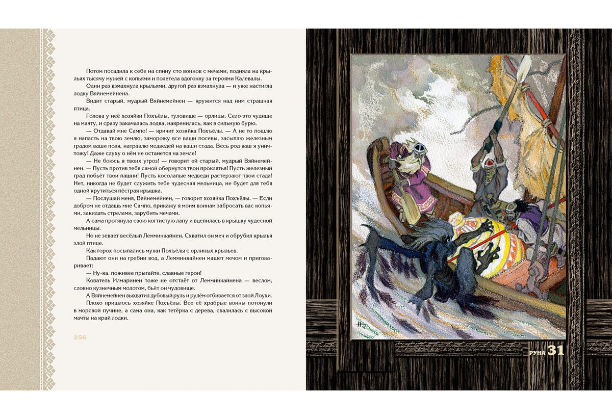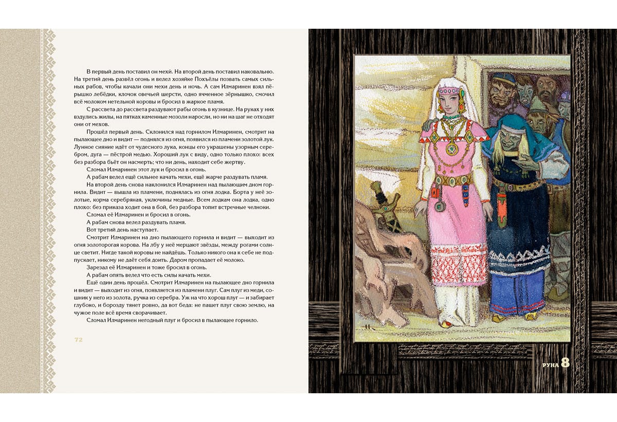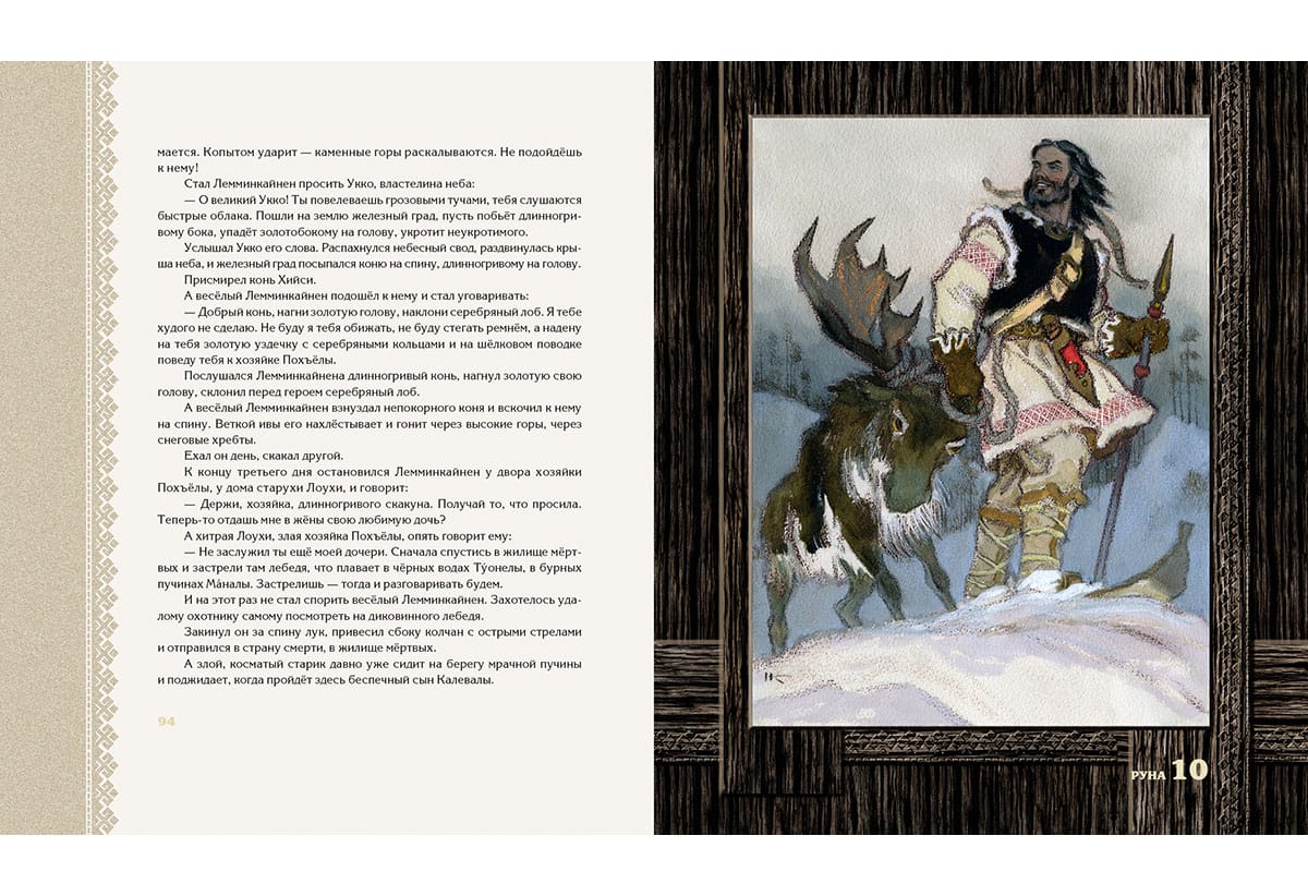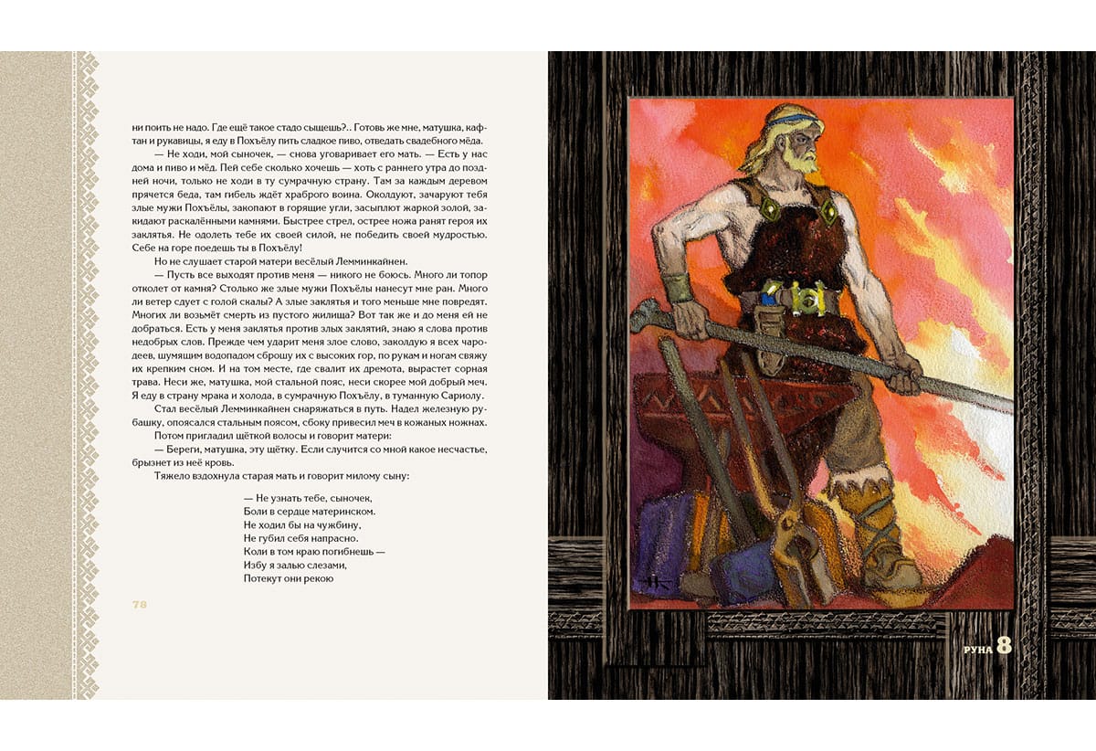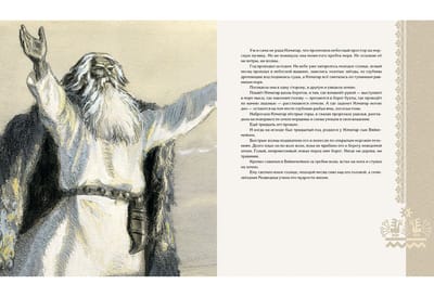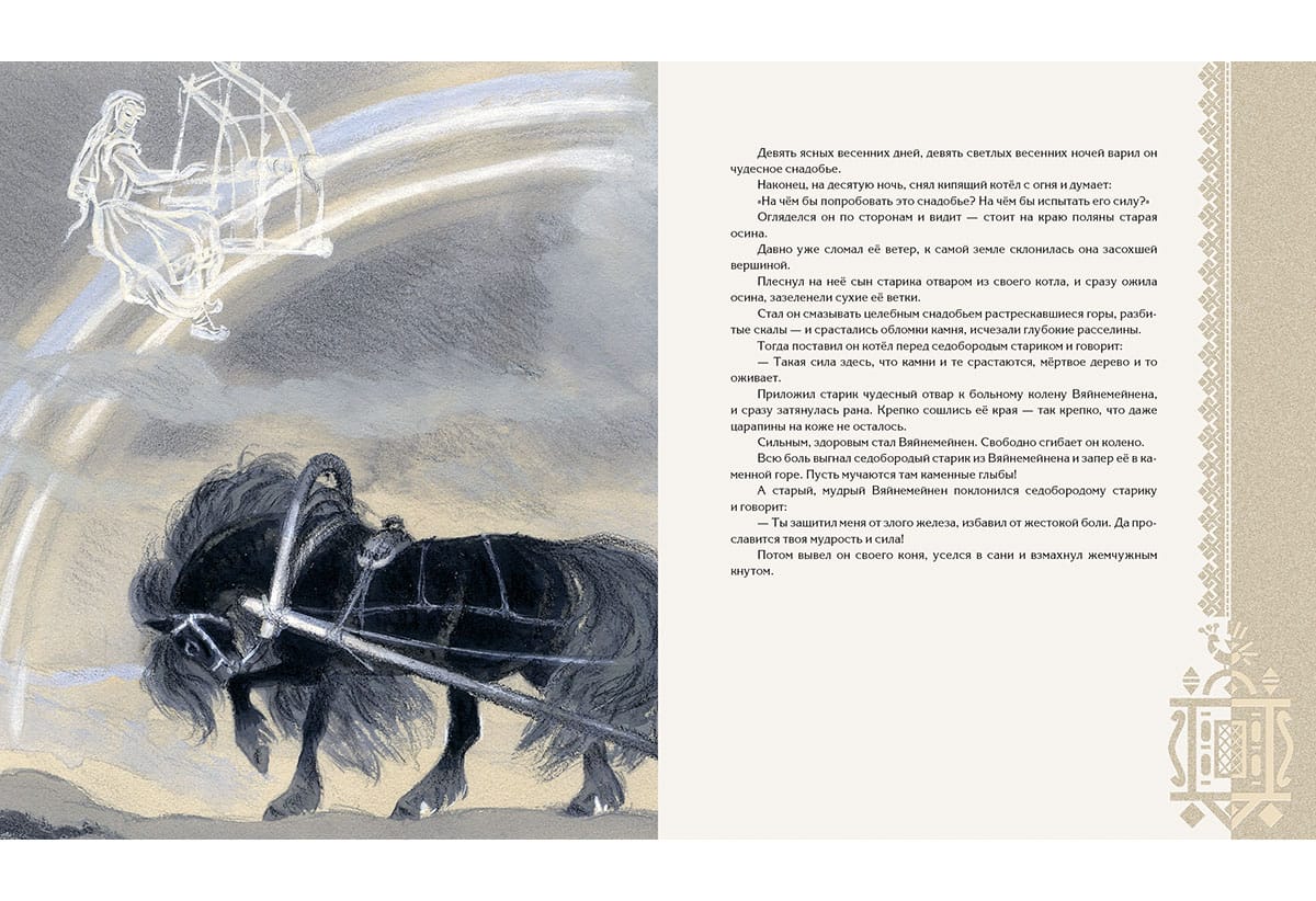 The children's (prose) version of the Karelian-Finnish epic "Kalevala" appeared in our country in 1953. It was in that year that a book containing a retelling by Alexandra Lyubarskaya, illustrated by Nikolai Kochergin, was published. For both the author of the text and the author of the illustrations "Kalevala" became a theme to which they addressed for several decades, revising and supplementing the initial versions. The writer kept polishing phrases, and the artist made more and more new sheets, striving for the ultimate imagery of the drawing. As a result, N. Kochergin created two independent versions of the book: black-and-white and color. The first one is considered to be stronger, more appropriate to the northern theme of the epic, more poignant. However, the black-and-white version is in fact also colored. It seems that it turned out to be black and white because the then polygraphers simply could not reproduce the complex shades invented by the artist. NIGMA Publishing House returns to the readers the black-and-white "Kalevala" in the form in which it was created by Nikolai Kochergin. At the same time we considered it possible to include in the book full-page color illustrations made by the master for the later version of "Kalevala". The Karelian-Finnish epic retold for children by Alexandra Lyubarskaya. About one hundred monochrome and color illustrations by Nikolai Kochergin.