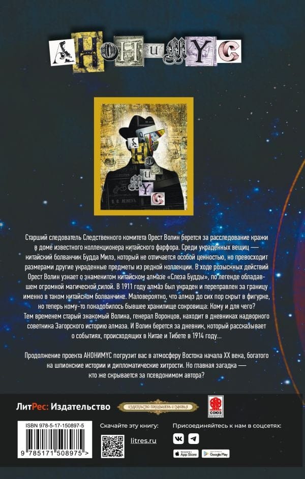 Orest Volin, a senior investigator of the Investigative Committee, takes on the investigation of a theft in the house of a famous collector of Chinese porcelain. Among the stolen items is a Chinese dummy Buddha Mile, which is not particularly valuable, but exceeds the size of other stolen items from a rare collection. In the course of the search Orest Volin learns about the famous Chinese diamond "Buddha's Tear", which according to legend has great magical power. In 1911 the diamond was stolen and sent abroad in just such a Chinese dummy. It is unlikely that the diamond is still hidden in the figurine, but now someone needs the former treasure vault. Who and for what purpose? Meanwhile, Volin's old acquaintance, General Vorontsov, finds the story of the diamond in the diaries of the court counselor Zagorsky. And Volin takes up the diary, which tells about the events taking place in China and Tibet in 1914... The continuation of the project ANONYMYC will immerse you in the atmosphere of the East of the early twentieth century, rich in spy stories and diplomatic tricks. But the main mystery is who is hiding behind the author's pseudonym?