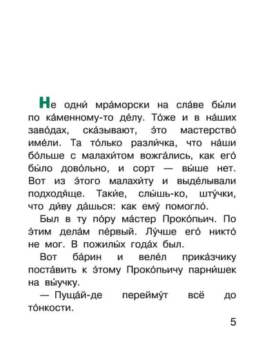In this book children will get acquainted with the talented Danila the Master and the mysterious Mistress of the Copper Mountain, will be able to admire the harsh and beautiful nature of the Urals, the unique culture of the Russian people. The story teaches courage and bravery, faith in one's dreams, awakens the desire for creativity. All words in the text are given with accents to help young readers independently familiarize themselves with one of the most fascinating tales of the writer.