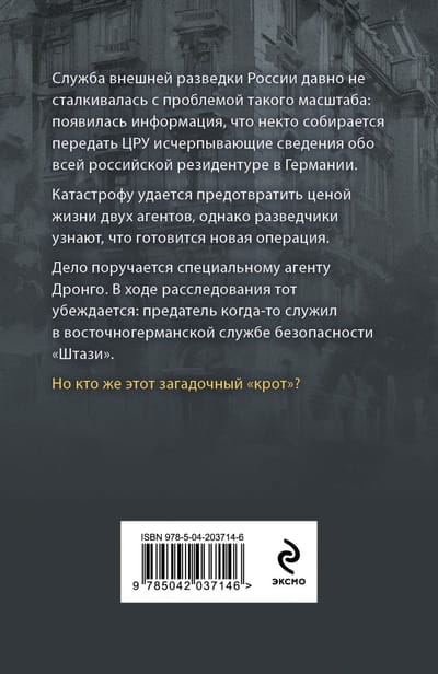 The Russian Foreign Intelligence Service has not faced a problem of this scale for a long time: information has come to light that someone is going to hand over to the CIA exhaustive information about the entire Russian residency in Germany. The catastrophe is prevented at the cost of the lives of two agents, but the scouts learn that a new operation is being prepared. The case is entrusted to special agent Drongo. In the course of the investigation he becomes convinced: the traitor once served in the East German security service "Stasi". But who is this mysterious "mole"?