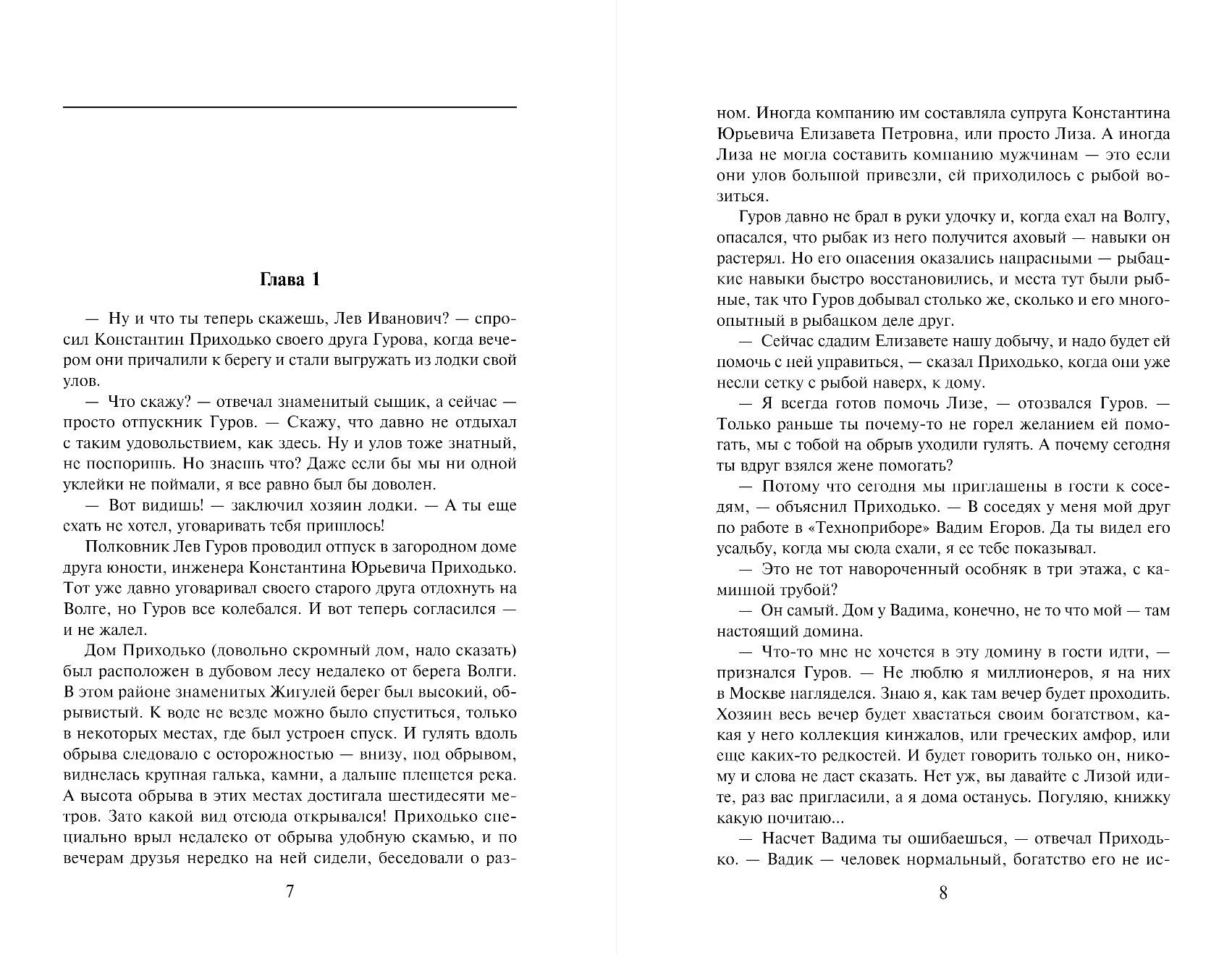 Interior Ministry Colonel Lev Gurov is vacationing at his friend's house on the banks of the Volga River. The idyll is broken by billionaire Egorov, who lives next door. Terrified, he reports that during a walk his wife fell off a cliff and apparently died. However, no body is found at the scene. The local police write everything off as an accident. But experienced Gurov suspects that deals with skillfully staged staging. The detective's assumptions strengthen the new complaints of Egorov. Tom at night began to appear "dead" wife and accuse him of committing a crime. Gurov studies the past of Mrs. Egorova and finds out that the "skeletons in her closet" is much scarier than the mysticism that saw the billionaire ... Nikolai Leonov, a former investigator of the MUR, firsthand knew how to solve the most intricate criminal cases. Therefore, each of his books - a true exciting story with unpredictable intrigue and an unexpected ending. The protagonist of these books, Colonel Lev Gurov - a detective of high class, moreover, with a lot of positive human qualities. He is respected by friends, feared by enemies and loved by women. He - a real domestic superman. Novels about Leo Gurov for forty years invariably attract fans of domestic detective. Became a classic series of "Black Cat" has more than 200 books, published in tens of millions of copies.