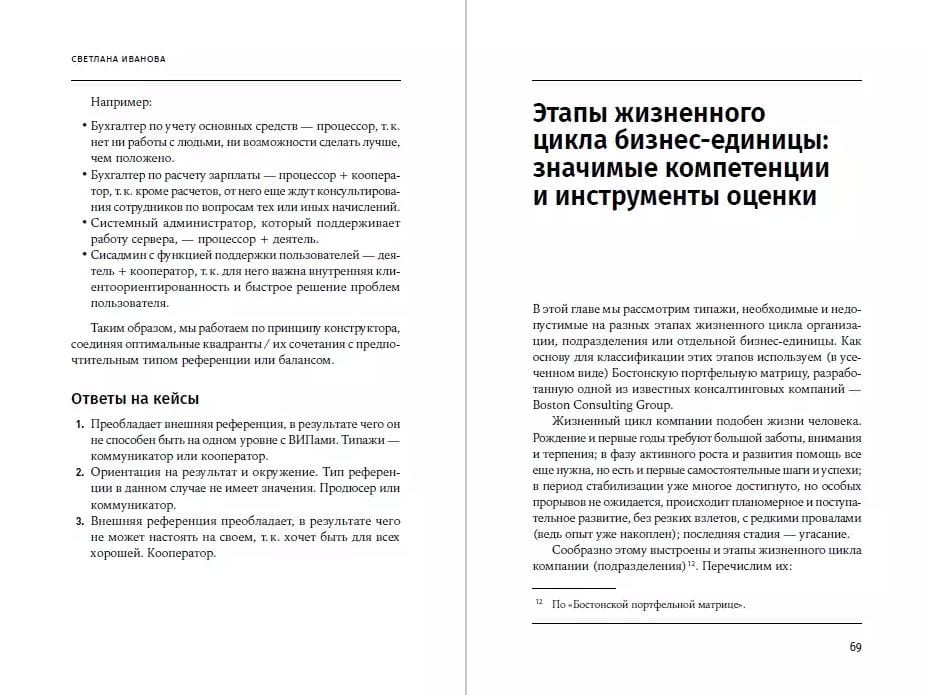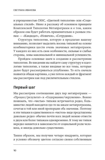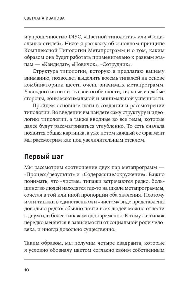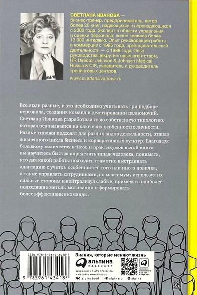 All people are different, and this must be taken into account when selecting personnel, creating teams and delegating authority. HR expert Svetlana Ivanova has developed her own typology, which is based on key personality traits. Different types are suitable for different types of activities, stages of the business life cycle and corporate cultures. Thanks to a large number of cases and workshops in this book, you will learn how to quickly determine a person's type, understand who is suitable for what job, competently build adaptation taking into account the characteristics of a particular newcomer, as well as manage employees, making the most of their strengths and neutralizing their weaknesses, apply the most suitable motivation methods and form more effective teams.
