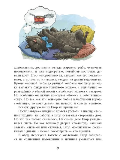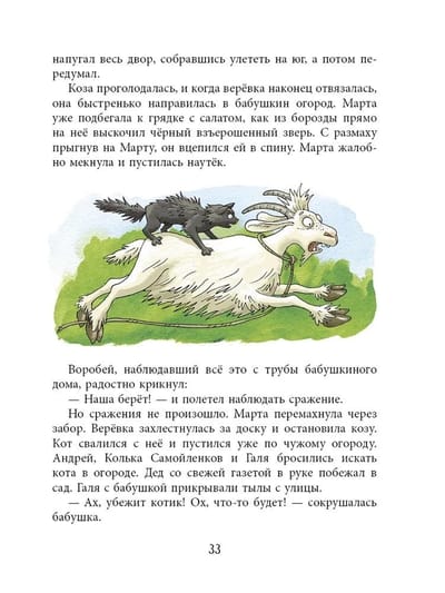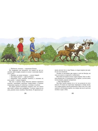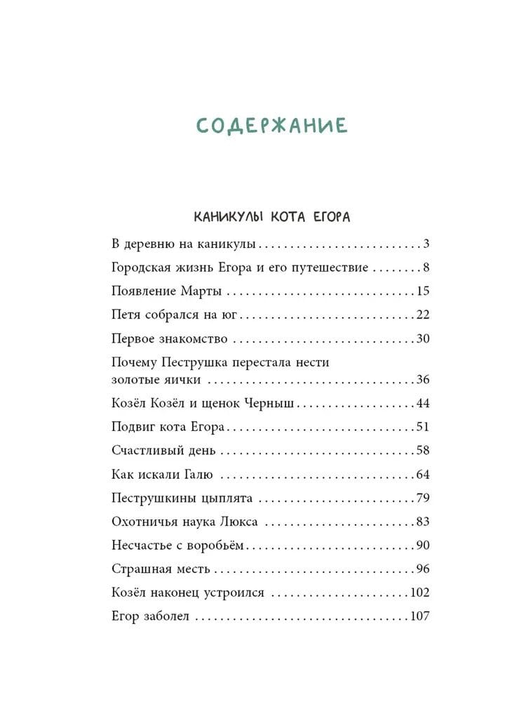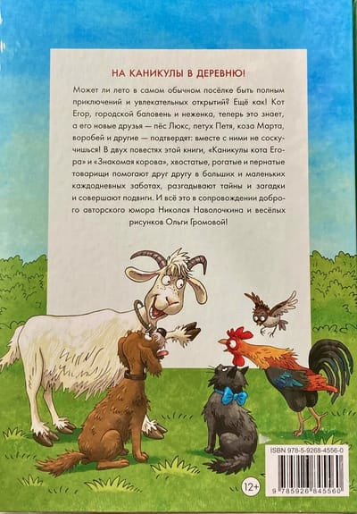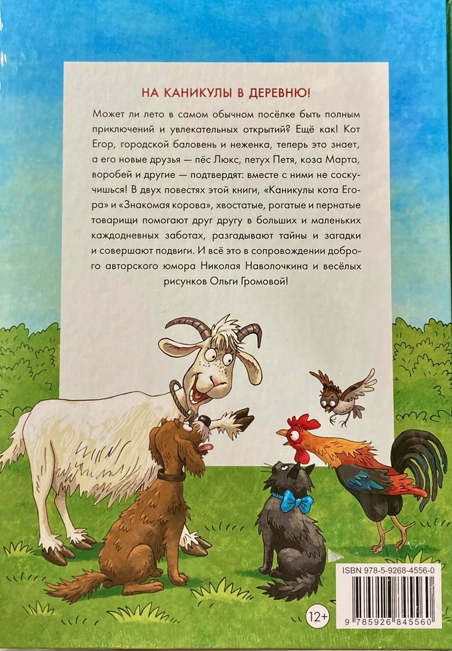 The collection includes two funny, kind and mischievous stories by Nikolai Navolochkin: "Egor the Cat's Vacation" and "Familiar Cow". In the first story readers will get acquainted with the cat Egor - pampered and gentle, whose whole life in one summer has changed. And all because Egor had to leave the cozy master apartment in the city and spend the vacations in the most ordinary village. There he is waiting for an exciting acquaintance with a huge and full of mysteries surrounding the world, new loyal friends and a real free life. But the adventure does not end there: there is one more summer ahead and one more story in which the inseparable company of Egor's tailed, horned and feathered friends will have to solve a real detective story - to solve the mystery of a familiar cow... Egor the cat, Lux the dog, Petya the rooster, Goat Goat, sparrow and others, as well as their fascinating adventures appear before the readers in the illustrations of the wonderful artist Olga Gromova.