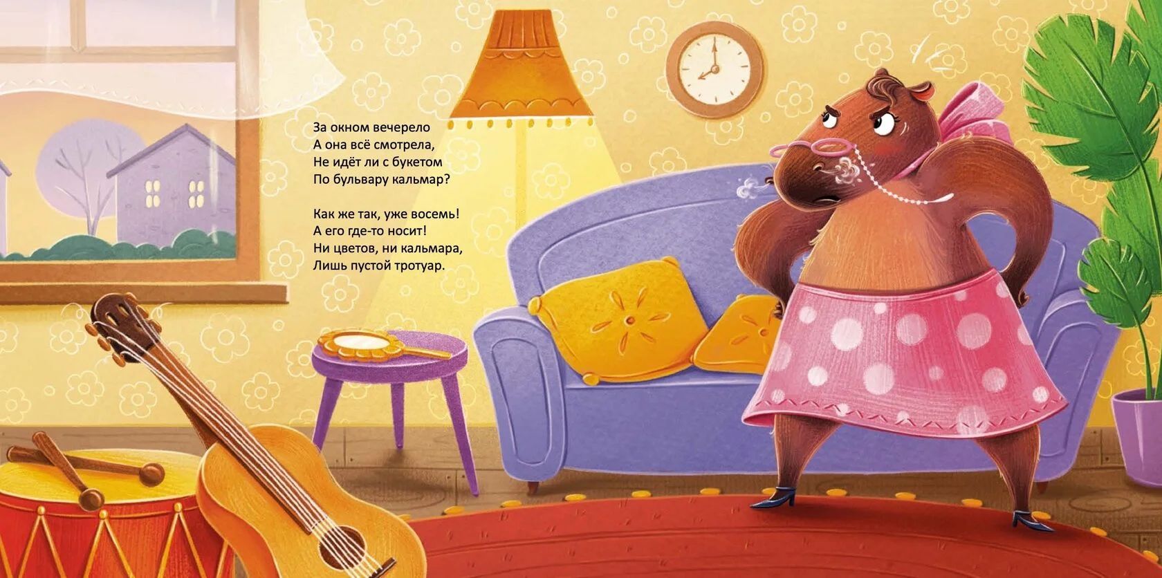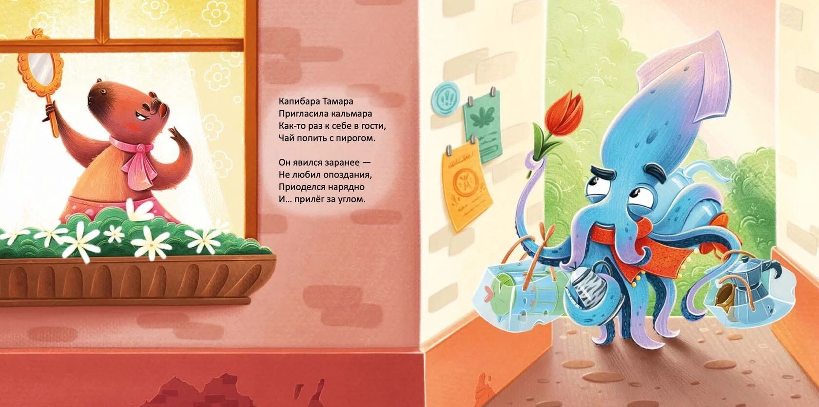 Capybara Tamara is waiting for a squid to visit, but the squid hasn't shown up. How come? Where is it? Maybe it's with the lobster? Or the cassowary? Has he forgotten about Tamara? Is he in love with cuttlefish Clara? Where is the squid? Help me find it!