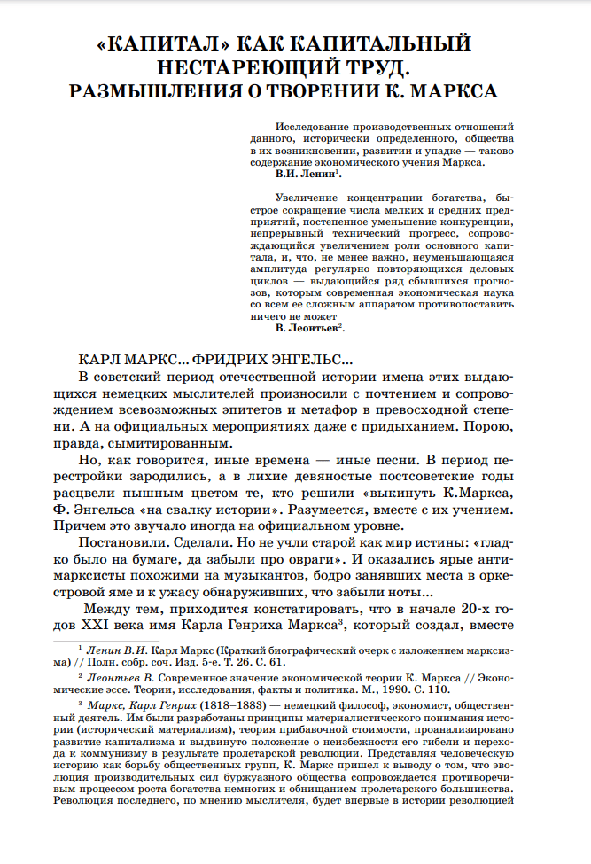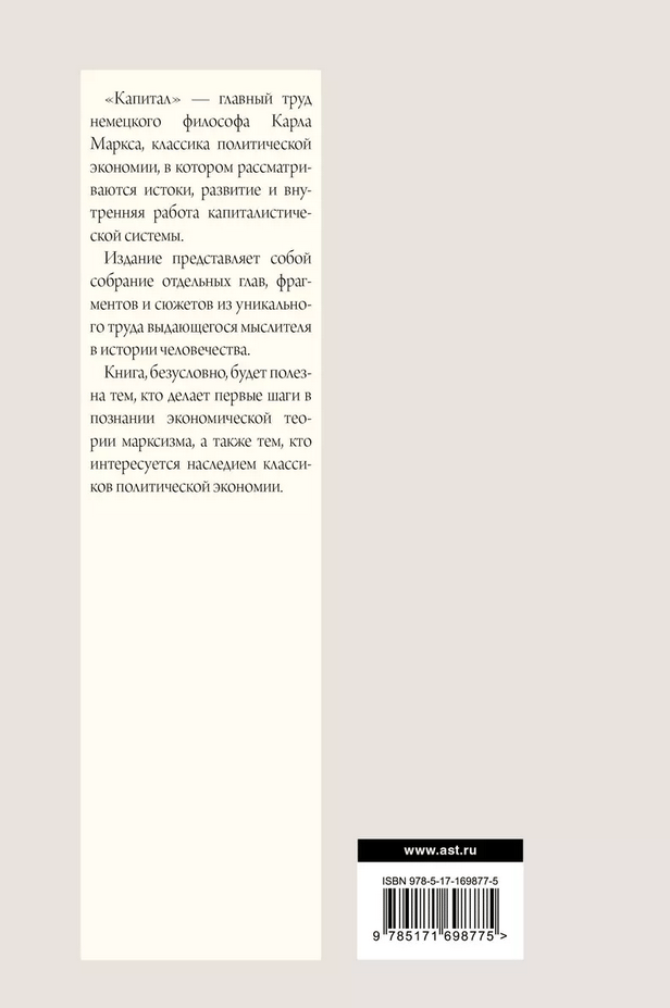 "Capital" is the major work of German philosopher Karl Marx, a classic of political economy, which examines the origins, development and inner workings of the capitalist system. This edition is a collection of selected chapters, fragments and stories from the unique work of the outstanding thinker in the history of mankind. In compiling it, special attention was paid to those materials that in the concrete-historical situation of modernity not only have not lost their relevance, but have been even more actualized. The book will certainly be useful for those who are taking their first steps in learning the economic theory of Marxism, as well as for those who are interested in the legacy of the classics of political economy, and for a wide readership.