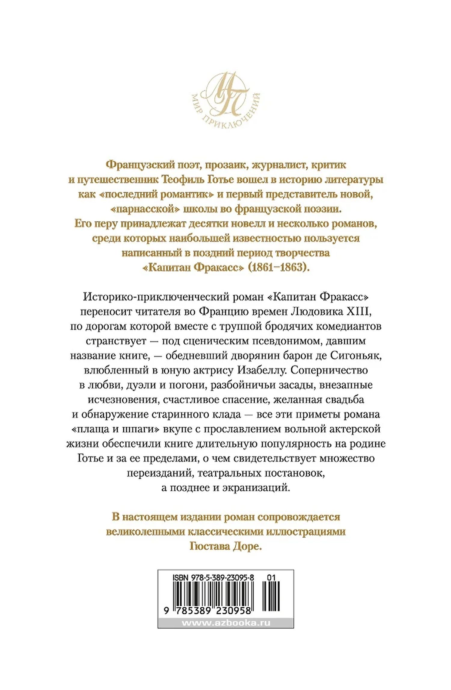 French poet, novelist, journalist, critic and traveler Theophile Gautier entered the history of literature as "the last romantic" and the first representative of the new, "Parnassian" school in French poetry. His pen belong to dozens of short stories and several novels, among which the most famous is written in the late period of creativity "Captain Fracasse" (1861-1863). This historical-adventure novel takes the reader to France at the time of Louis XIII, on the roads of which, along with a troupe of traveling comedians wanders - under a stage name, which gave the name of the book - impoverished nobleman Baron de Sigonyak, in love with a young actress Isabella. Rivalry in love, duels and chases, robber ambushes, sudden disappearances, a happy rescue, the desired wedding and the discovery of an ancient treasure - all these signs of the novel "cloak and sword" coupled with the glorification of free acting life ensured the book's long popularity in Gautier's homeland and beyond, as evidenced by the many reprints, theatrical productions, and later screenings. In this edition, the novel is accompanied by Gustave Doré's magnificent classical illustrations.