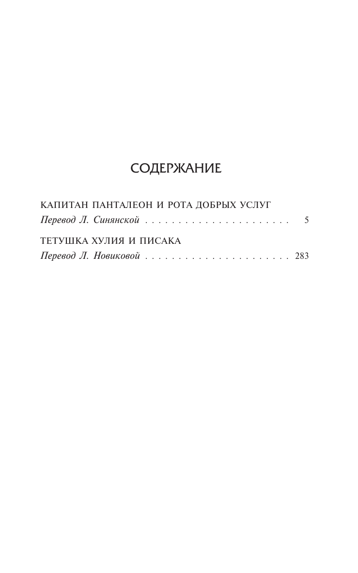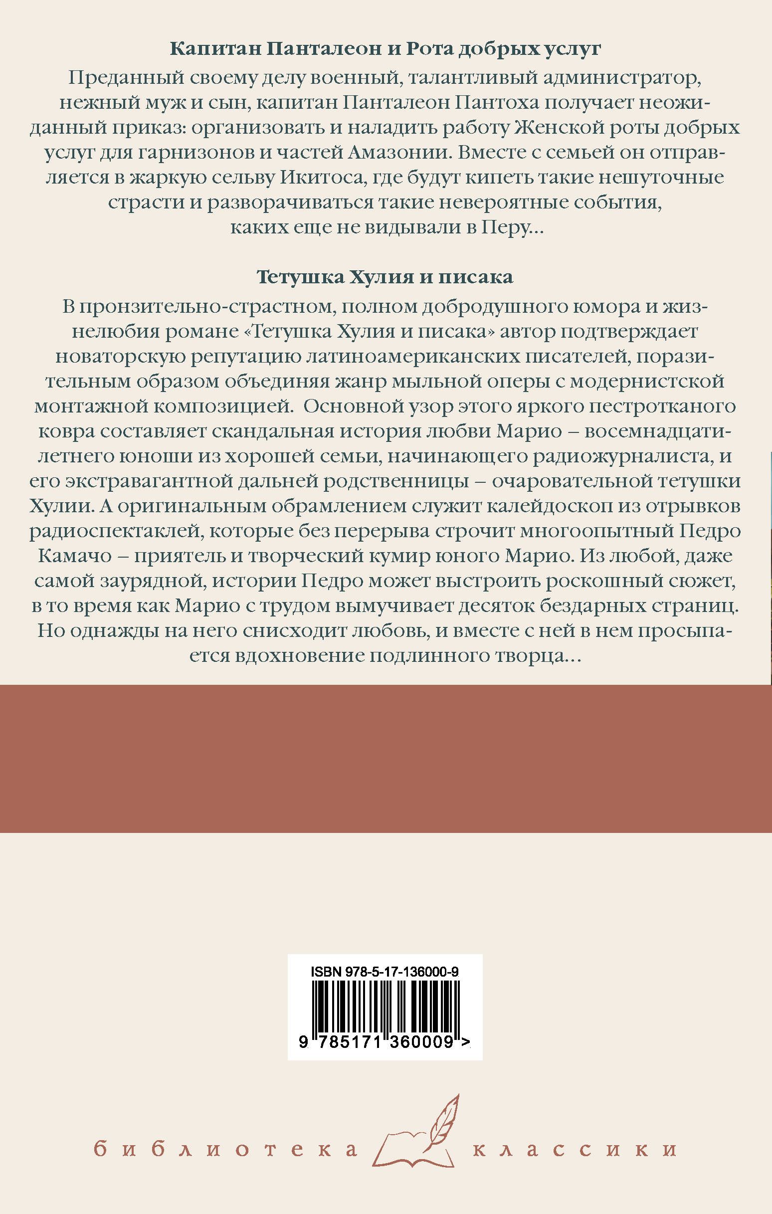 The collection includes two works of the author: the novel “Captain Pantaleon and the Company of Good Services” and the autobiographical narrative about first love – “Aunt Julia and the Writer”.