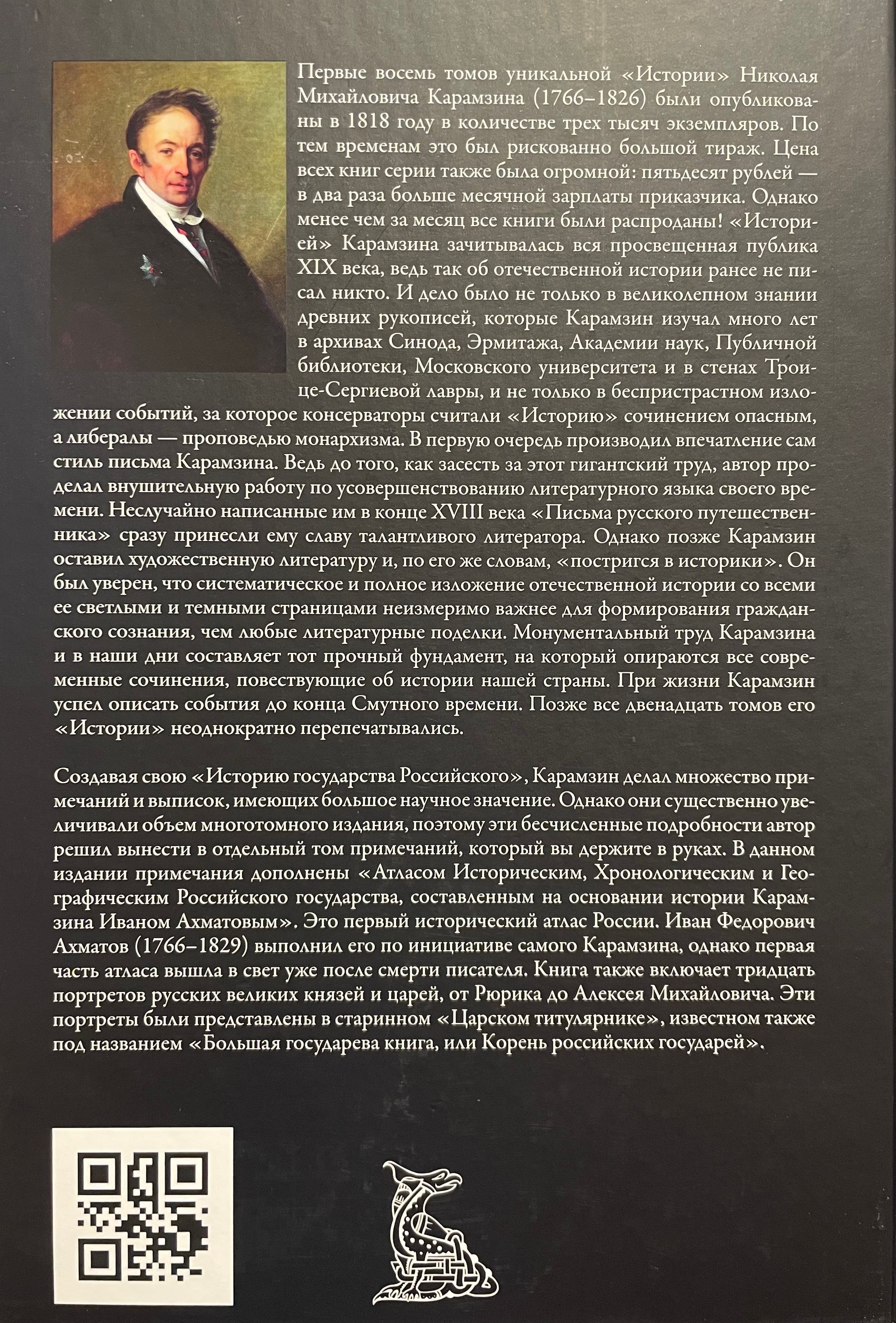 The first eight volumes of Nikolai Mikhailovich Karamzin's (1766–1826) unique "History" were published in 1818 in a limited edition of three thousand copies. At the time, this was a risky print run. The price of all the books in the series was also enormous: fifty rubles—twice a clerk's monthly salary. However, in less than a month, all the books were sold out! Karamzin's "History" was devoured by the entire enlightened public of the 19th century, for no one had previously written about Russian history in such a way. This was not only due to his superb knowledge of ancient manuscripts, which Karamzin studied for many years in the archives of the Synod, the Hermitage, the Academy of Sciences, the Public Library, Moscow University, and within the walls of the Trinity Lavra of St. Sergius, nor was it only due to his impartial presentation of events, which led conservatives to consider it a dangerous work and liberals to consider it a preaching of monarchism. Karamzin's writing style itself was the most impressive. After all, before sitting down to write this monumental work, the author had accomplished a remarkable feat of refining the literary language of his time. It's no coincidence that his "Letters of a Russian Traveler," written at the end of the 18th century, immediately brought him fame as a talented writer. However, Karamzin later abandoned fiction and, in his own words, "took the veil of history." He believed that a systematic and complete account of Russian history, with all its bright and dark pages, was immeasurably more important for shaping civic consciousness than any literary concoction. Karamzin's monumental work continues to this day to form the solid foundation upon which all modern works recounting the history of our country rest. During his lifetime, Karamzin managed to describe events up to the end of the Time of Troubles. All twelve volumes of his "History" have subsequently been reprinted numerous times.