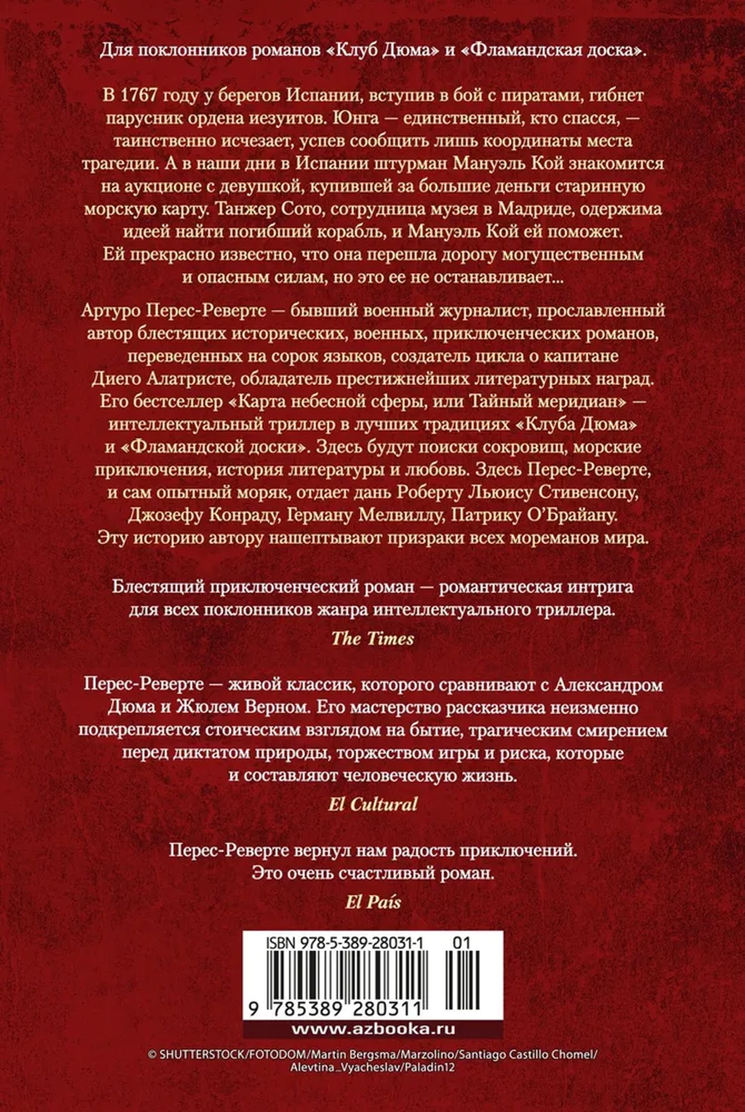 Arturo Perez-Reverte is a former military journalist, a renowned author of brilliant historical, military, and adventure novels translated into forty languages, the creator of the cycle about Captain Diego Alatriste, and the winner of prestigious literary awards. His bestseller "The Map of the Celestial Sphere, or the Secret Meridian" is an intellectual thriller in the best traditions of the "Dumas Club" and "The Flemish Board". The ghosts of all the world's sailors are hovering here. Here Perez-Reverte, himself an experienced sailor, pays tribute to Robert Louis Stevenson, Joseph Conrad, Herman Melville, and Patrick O'Brian. Here, sea adventures are inseparable from history, literature, and love.