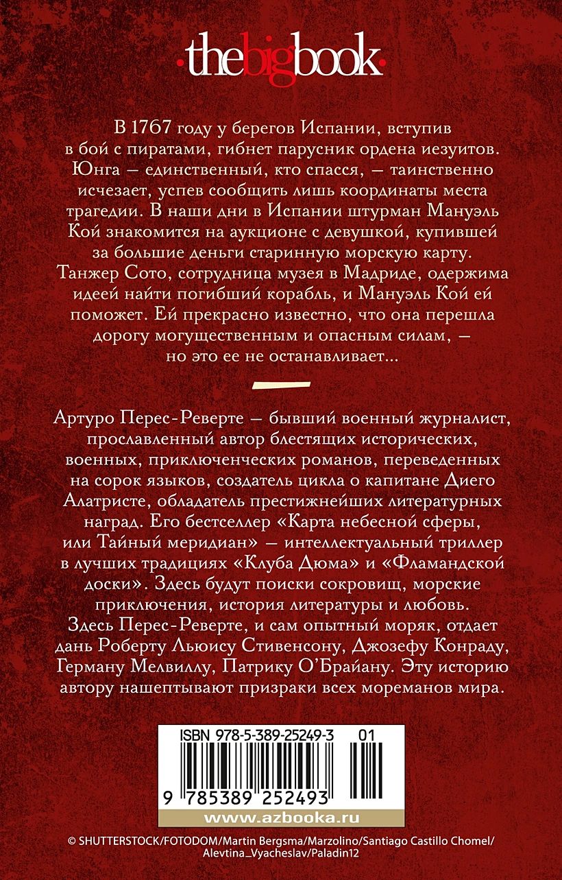 1767, February. The sailing ship "Dei Gloria", belonging to the Jesuit order, dies off the coast of Spain after a battle with pirates. Yunga - the only one who was saved - mysteriously disappears, not having time to tell about what happened. All that he managed to report - the coordinates of the place of the tragedy ... Spain, present day. The navigator Manuel Coy, temporarily deprived of the right to engage in ship activities for the fact that landed the ship on the shoal, gets acquainted at an auction with a girl who bought for a lot of money an ancient sea map. Tangier Soto, an employee of a museum in Madrid, is maniacally obsessed with the idea of finding a lost ship, going, as she believes, with a cargo of extreme importance. She takes Manuel Coy as her assistant as an experienced navigator. The girl is well aware that she crossed the road powerful and dangerous forces that can go to any lengths, just to eliminate the rival - but it does not stop her ... Arturo Perez-Reverte - a former military journalist, the celebrated author of brilliant historical, military, adventure novels, translated into forty languages, the creator of the cycle of Captain Diego Alatrista, the owner of the most prestigious literary awards. His bestseller "Map of the Celestial Sphere, or Secret Meridian" - an intellectual thriller in the best traditions of "Club Dumas" and "Flemish board". Here hover the ghosts of all the seafarers of the world. Here Perez-Reverte, himself an experienced sailor, pays tribute to Robert Lewis Stevenson, Joseph Conrad, Herman Melville, Patrick O'Brian. Here, maritime adventure is inseparable from history, literature, and love.