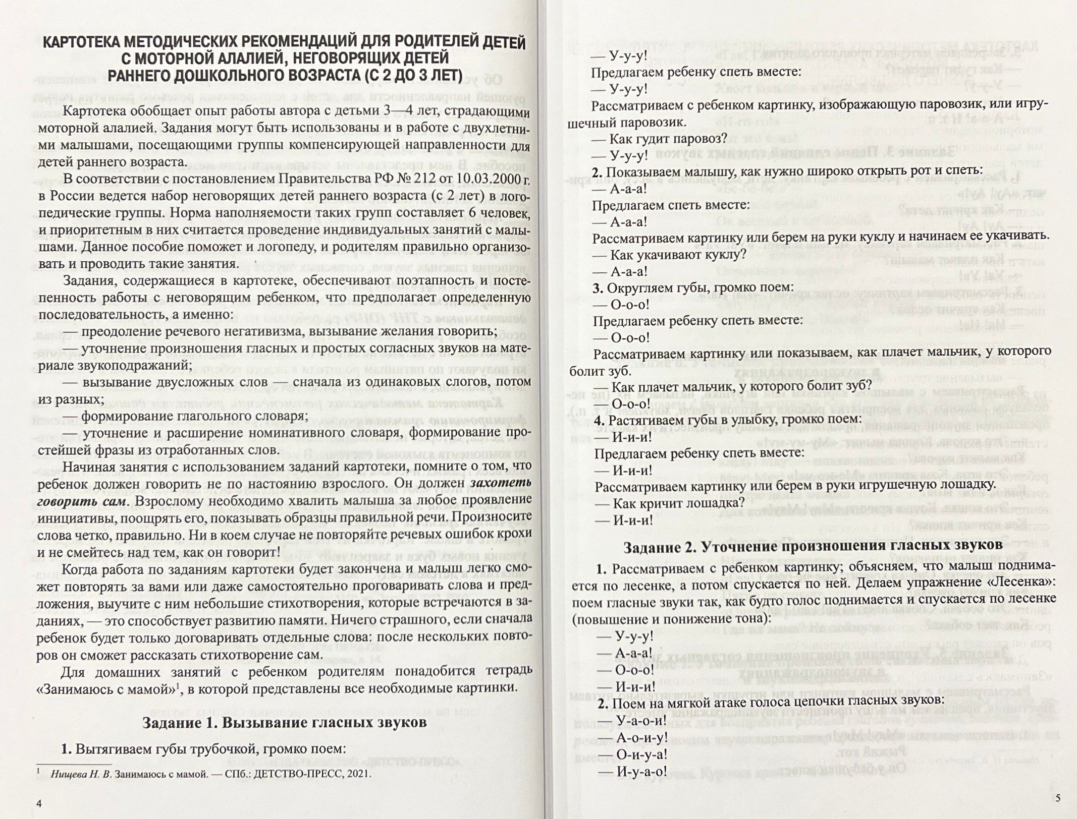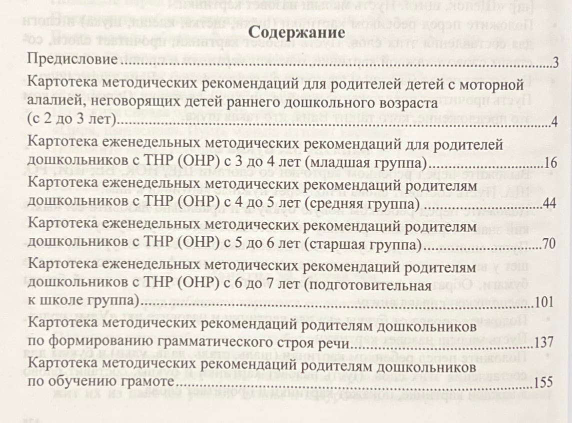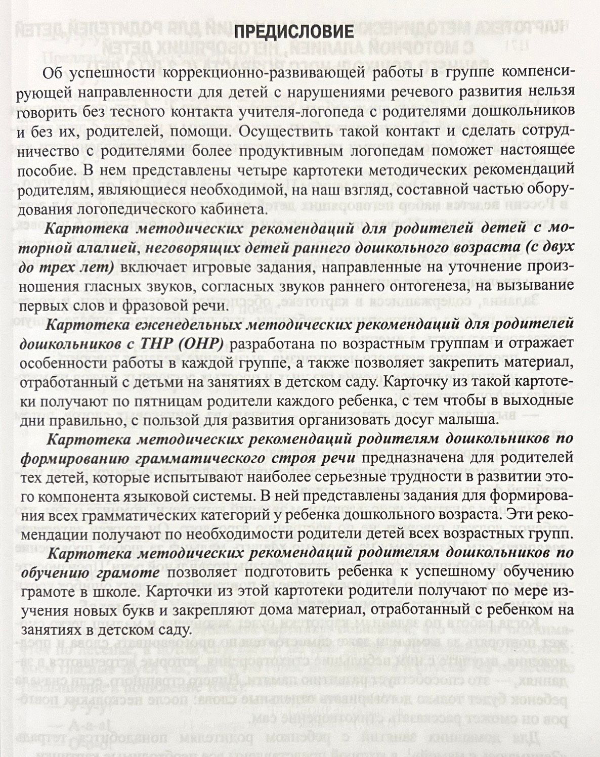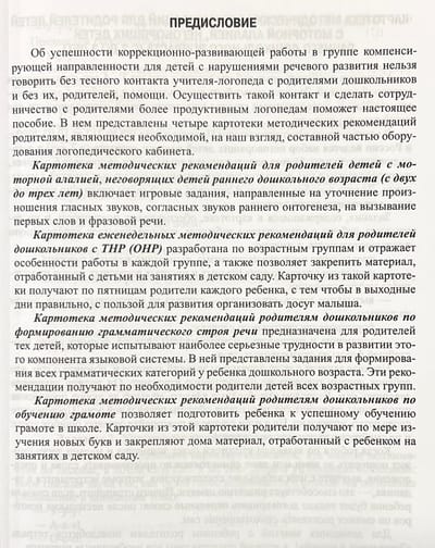 The manual presents card index cards of methodological recommendations of a speech therapist to parents of preschoolers in all areas of child speech development: card index cards of weekly recommendations of a speech therapist to parents in all age groups for children with speech development disorders, card index cards of recommendations for the formation and improvement of grammatical structure of speech, card index cards of recommendations for teaching preschoolers literacy. Card catalogs are a necessary part of the equipment of the speech therapy room.