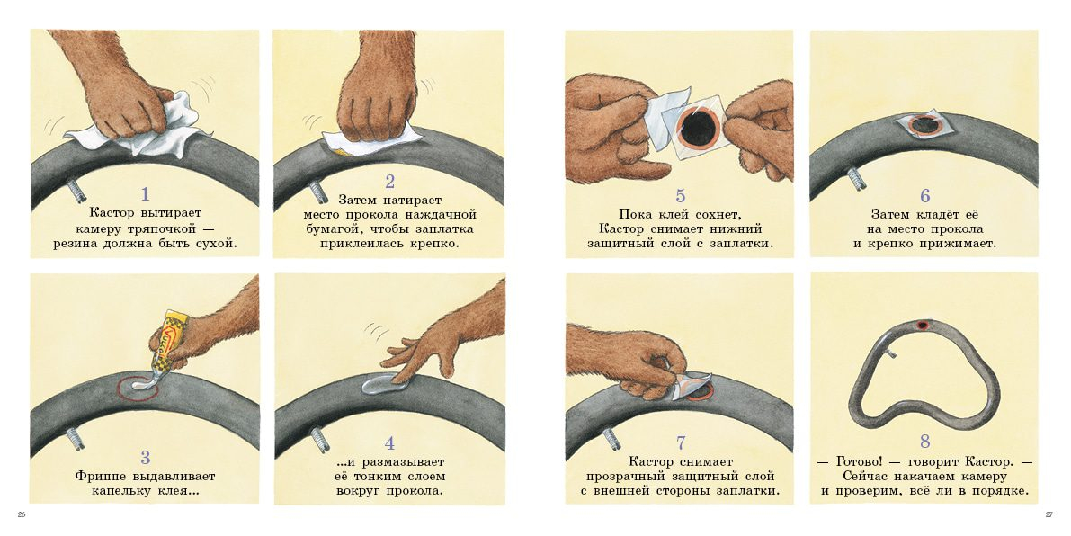 One day, Castor the beaver and his friend Fripp the beaver got on their bikes and went on a picnic. But alas, not far from home, Fripp ran over a nail and punctured the tire. What to do? Fix it, of course! Castor shows Fripp how to properly remove the wheel, find the puncture and put on a patch. He explains that a bicycle tire consists of a tire and an inner tube, shows how to use tire levers and how not to lose small parts during the repair process. It turns out that repairing a tire is so much fun! And not at all difficult. The charming beaver Castor and his young friend Fripp are already well known to many readers. They know how to bake pies, grow beans, do carpentry and paint, and they do it so infectiously that you definitely want to repeat everything after them. Castor the beaver is known and loved by children in twenty-five countries around the world. His creator is the legendary Swedish children's writer and illustrator Lars Klinting, winner of many international awards.