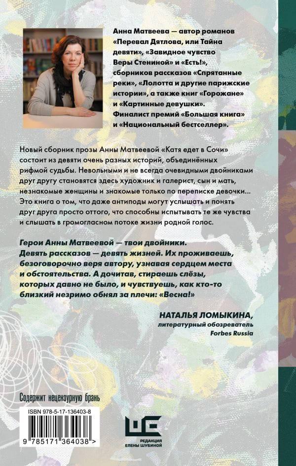 Anna Matveeva is the author of the novels "Dyatlov Pass, or the Secret of Nine", "The Enviable Feeling of Vera Stenina" and "Got it!", the short story collections "Hidden Rivers", "Lolotte and Other Parisian Stories", as well as the books "City People" and "Picture Girls". A finalist for the "Big Book" and "National Bestseller" awards.Anna Matveeva's new prose collection "Katya Goes to Sochi" consists of nine very different stories united by the rhyme of fate. Involuntary and not always obvious doppelgangers to each other become here an artist and a gallerist, a son and a mother, unknown women and familiar only by correspondence girls ... This is a book about the fact that even antipodes can hear and understand each other simply because they are able to feel the same feelings and hear in the thundering stream of life native voice. "Everyone has his or her double, but sometimes you can't recognize it at once..." (Anna Matveeva) "The heroes of Anna Matveeva are your doppelgangers. Nine stories - nine lives. You live them, unconditionally believing the author, recognizing places and circumstances with your heart. And having finished reading, you wipe away the tears that you haven't had for a long time, and feel as someone close invisibly hugged you by the shoulders: "Spring!"" (Natalia Lomykina, Forbes Russia literary columnist)