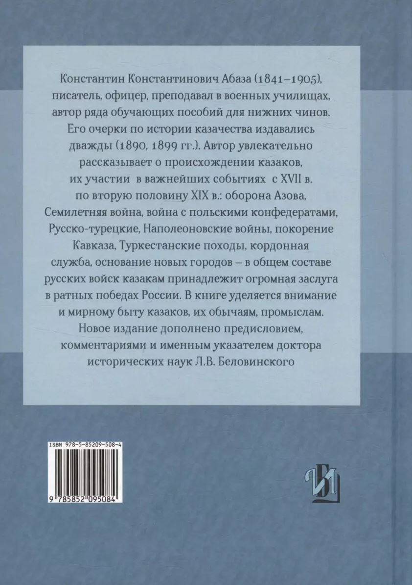 Konstantin Konstantinovich Abaza (1841-1905), writer, officer, taught in military schools, author of a number of training manuals for lower ranks. His essays on the history of the Cossacks were published twice (1890, 1899). The author fascinatingly tells about the origin of the Cossacks, their participation in the most important events from the XVII century to the second half of the XIX century: the defense of Azov, the Seven Years' War, the war with the Polish confederates, the Russo-Turkish, Napoleonic wars, the conquest of the Caucasus, the Turkestan campaigns, cordon service, the founding of new cities - in the total composition of the Russian troops Cossacks have a great merit in the victories of Russia. The book pays attention to the peaceful life of the Cossacks, their customs and trades.