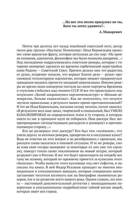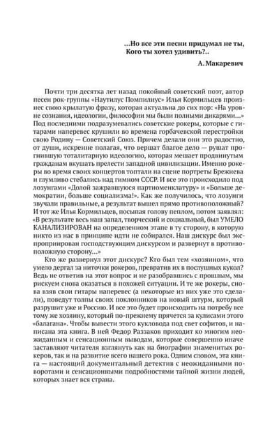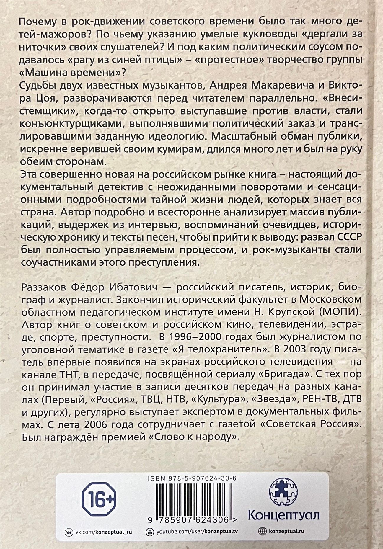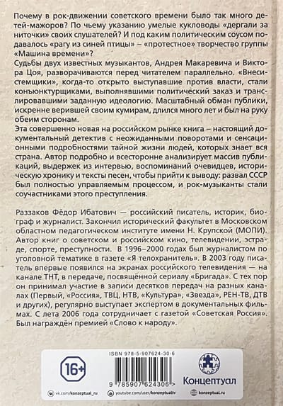 Why were there so many child majors in the rock movement of the Soviet era? On whose instructions did skillful puppeteers "pull the strings" of their listeners? And under what political sauce was the "bluebird stew" - the "protest" work of the band "Mashina Vremeni" served? The fates of two famous musicians, Andrei Makarevich and Viktor Tsoi, unfold before the reader in parallel. "Vneshsistemtsy", once openly opposed to the authorities, became opportunists, fulfilling a political order and broadcasting a given ideology. The large-scale deception of the public, who sincerely believed in their idols, lasted for many years and benefited both sides. This book, completely new on the Russian market, is a real documentary detective with unexpected twists and sensational details of the secret lives of people whom the whole country knows.