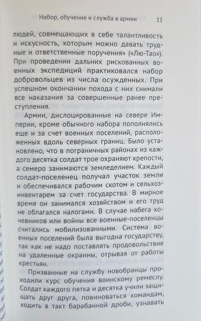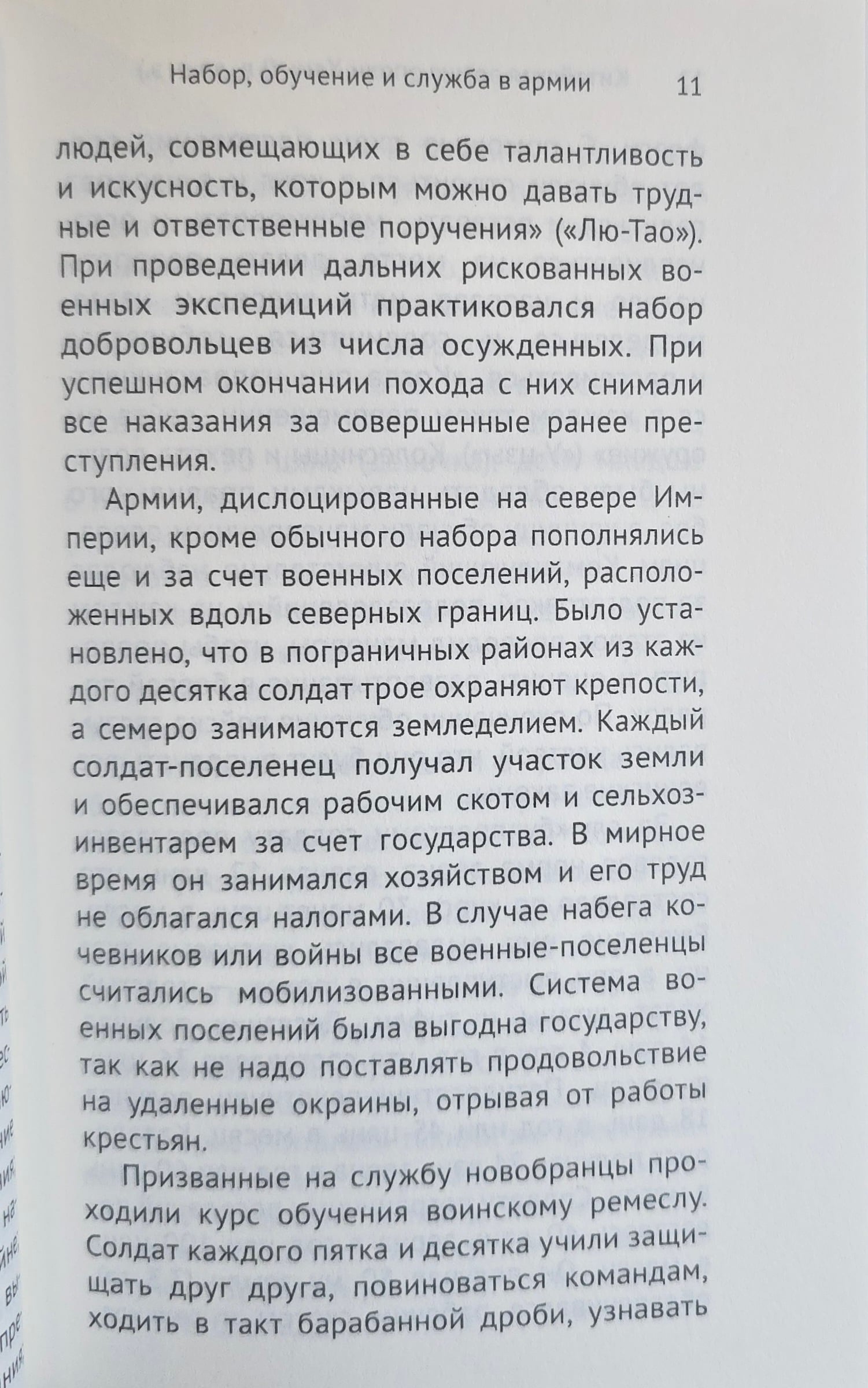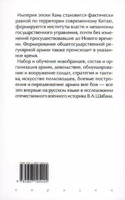 During the Han era, China became an empire, virtually equal in territory to modern China, and institutions of power and mechanisms of state administration were formed, which existed almost unchanged until modern times. Likewise, the formation of a nationwide regular army took place at the same time. Recruitment and training of recruits; composition and organization of the army; provisions, uniforms and weapons of soldiers; strategy and tactics, the art of commanders; battle formations and movement of the army outside of battle - all this is presented for the first time in Russian in the study of the Russian military historian V. A. Shaban.