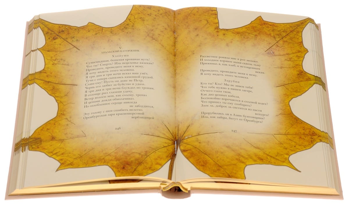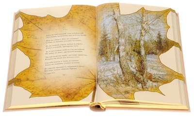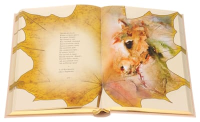 Original gift edition with lasso. The leather binding is decorated with gold embossing and fragments of illustrations. The book has a three-sided gold trim.