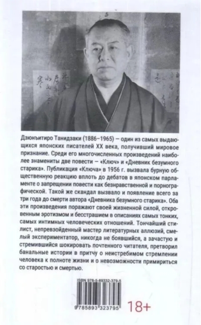 Tanizaki Jun'ichirō (1886-1965) is one of the most prominent Japanese writers of the 20th century, achieving international acclaim. Among his many works, the most famous are two novels: The Key and Diary of a Mad Old Man. The publication of The Key in 1956 provoked a stormy public reaction, leading to debates in the Japanese Diet about banning the novel as immoral and pornographic. A similar scandal followed the publication of Diary of a Mad Old Man, just three years before the author's death. Both of these works are striking in their vitality, frank eroticism, and fearless depictions of the most subtle, intimate human relationships. A subtle stylist, an unrivaled master of literary allusions, a bold experimenter who was never afraid, and often sought to shock, the venerable reader, transformed banal stories into a parable about man's ineradicable desire for a full life and the impossibility of coming to terms with old age and death.