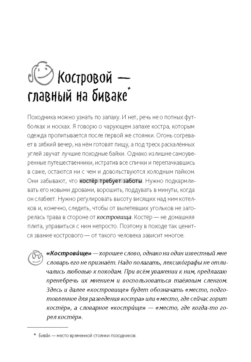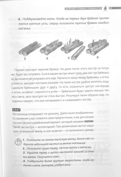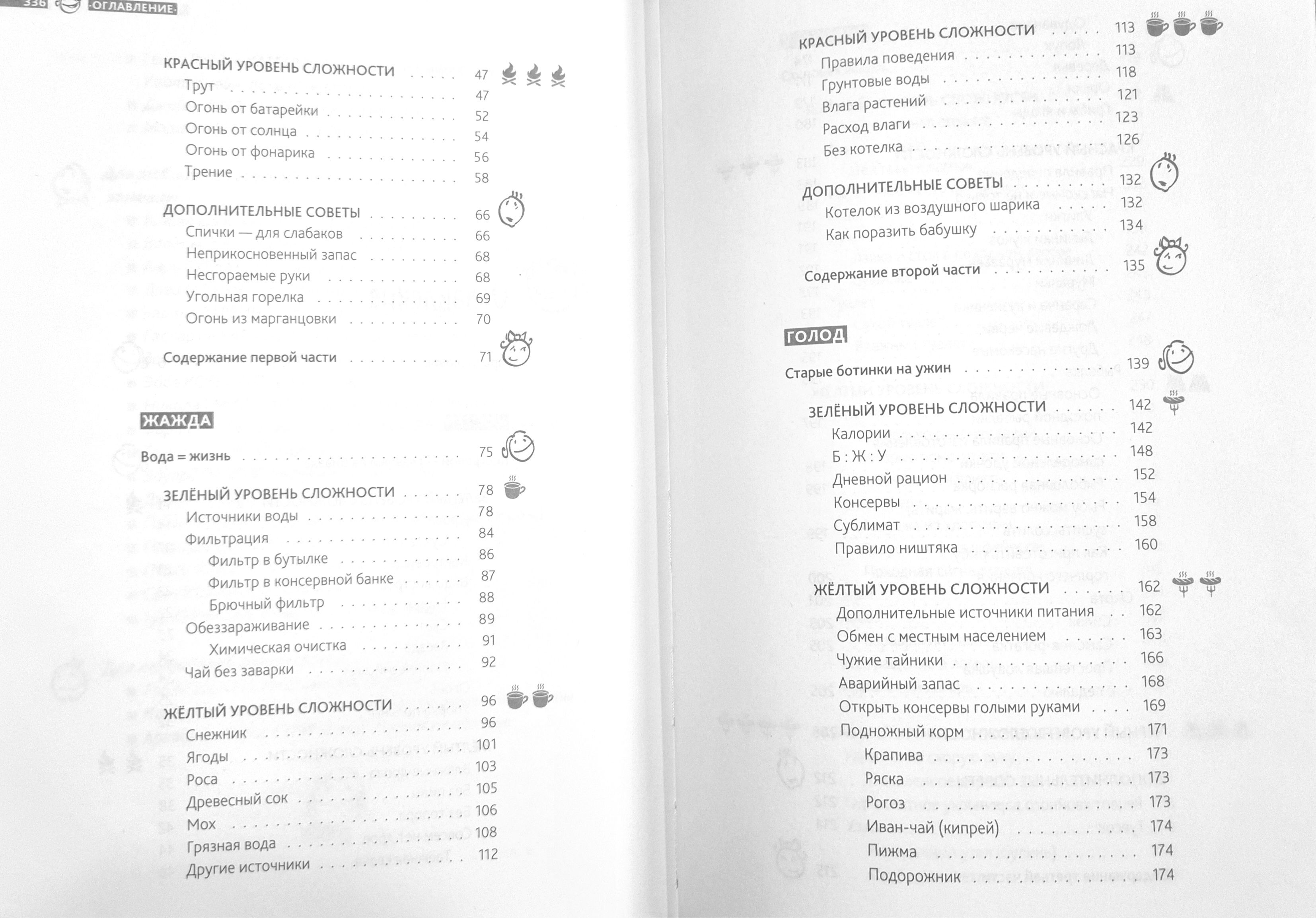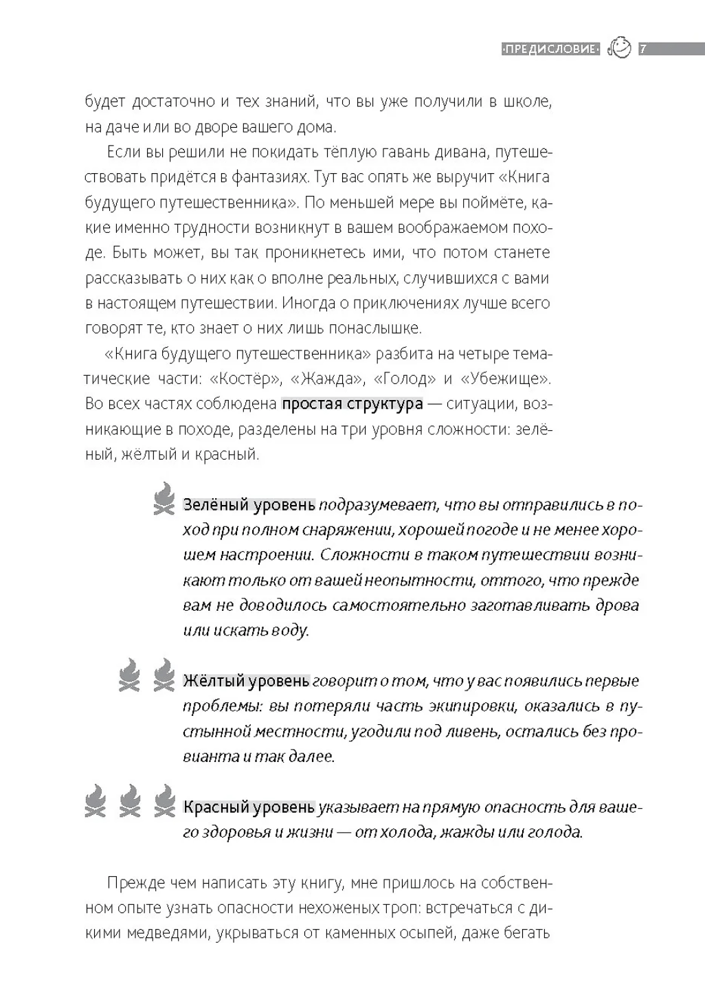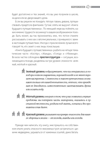 “The Book of the Future Traveler” is a fascinating encyclopedia of knowledge and skills that will be useful both on a family picnic and on a real hike. It contains four large parts: “Bonfire,” “Thirst,” “Hunger,” and “Shelter.” Each of them describes three levels of difficulties that await any traveler.