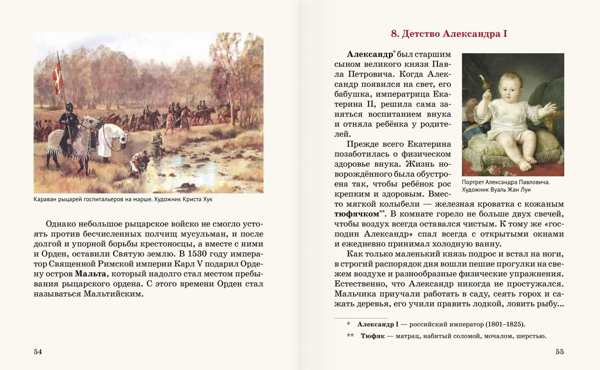 The texts are complete fragments or whole works taken from educational (primarily pre-revolutionary) literature, historians' works, works of fiction, biographical prose, memoirs and other sources, a list of which is given at the end of each book. Reproductions of many paintings by the great Russian artists V. M. and A. M. Vasnetsov, M. V. Nesterov, N. K. Roerich, I. Y. Bilibin and others, as well as photographic documents are used as illustrations.
