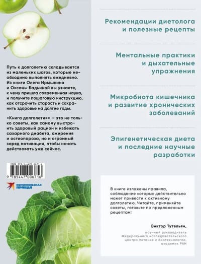 You can start the road to longevity at any age - at 25, 35, and 65. On the pages of this book, everyone will get a strategy for preserving youth and will be able to build not only their own diet, but also their lifestyle. How to preserve muscle mass and prevent osteoporosis? Is it possible to improve gut microbiota and avoid the development of chronic diseases? Does our daily diet affect our genes? Why do we need an epigenetic diet? Where does obesity begin in children? How to avoid mood swings? What are telomeres and how do they affect aging? Answers to vital questions you will find in "The Book of Longevity" by endocrinologist Oleg Iryshkin and nutritionist Oksana Badiina, written together with other recognized experts - pediatricians, nutritionists, oncologists.