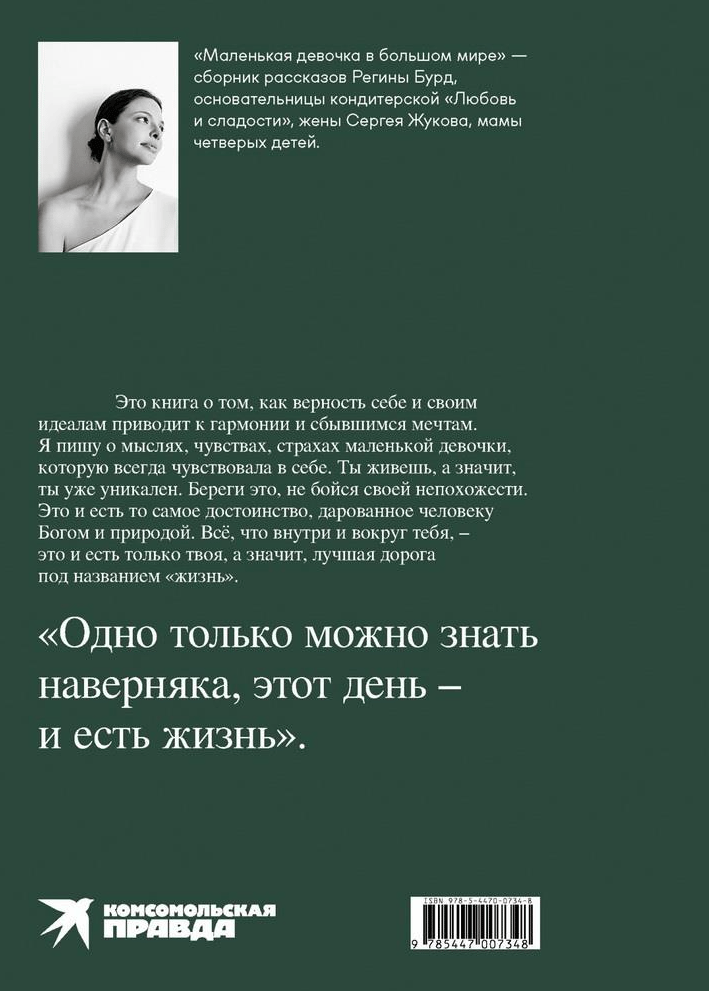 “Little girl in the big world” – a collection of stories by Regina Burd, founder of the confectionery “Love and sweets”, wife of the leader of the group “Hands up!” Sergey Zhukov, mother of four children. This is the story of a sensitive person in a very loud world, which shows that being “different” is not scary if you stay true to yourself and make decisions with your heart. The book includes frank and piercingly sincere stories about childhood, creative path, romance and marriage, happy motherhood.