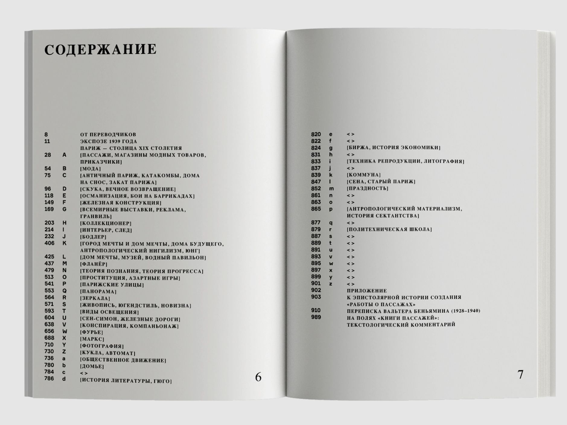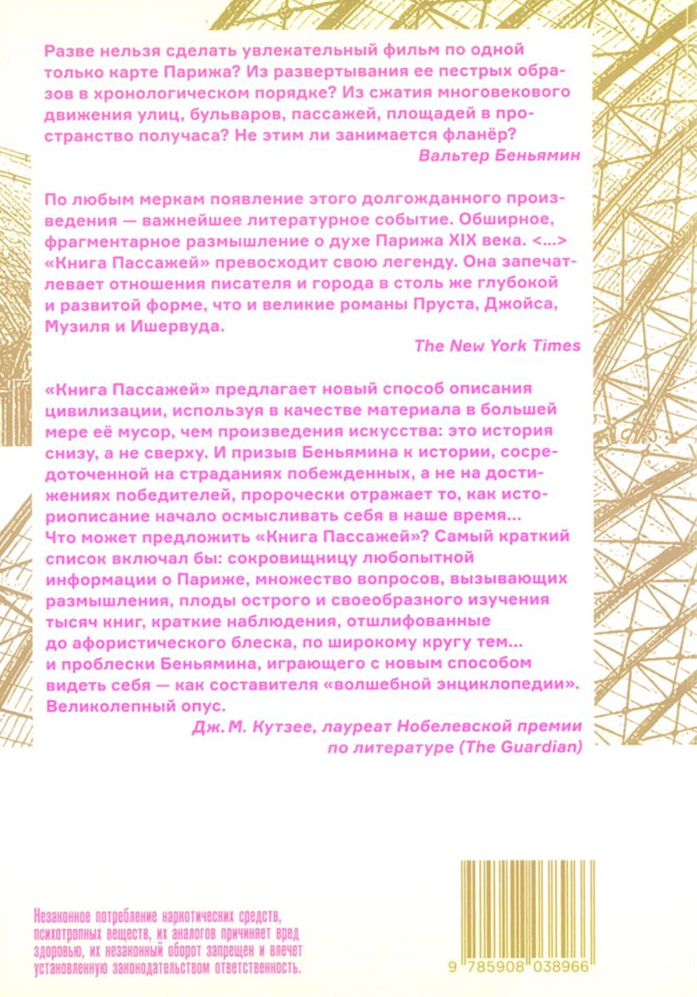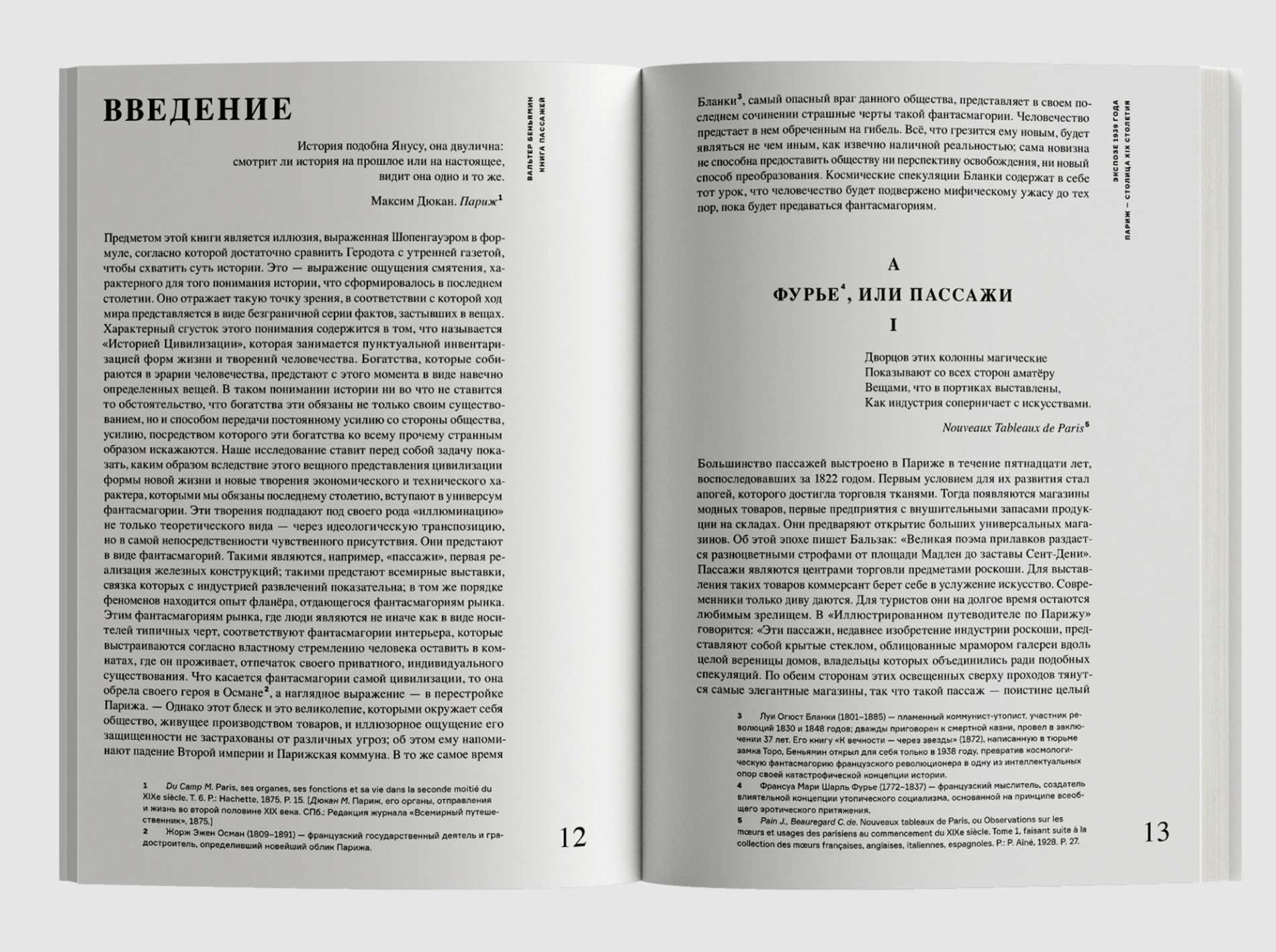 Walter Benjamin's (1892–1940) unfinished work on the emergence of modernité in mid-19th-century Paris was reconstructed from the author's surviving manuscripts and published only in 1982. It is an annotated anthology of the culture and everyday life of the French capital during a period of turbulent urban transformation and artistic breakthroughs, for which Benjamin dubbed Paris "the capital of the nineteenth century." The complex structure of this anthology includes, alongside the author's texts, excerpts from literature, the press, and ephemera, grouped thematically and comprehensively reflecting the life of the city. "The Book of Passages" is an example of innovative historical perspective, surveying the material with the fleeting eye of a flâneur, and at the same time a penetrating, long-term analysis of the most important vectors of contemporary culture. This is the first time it has been published in Russian.