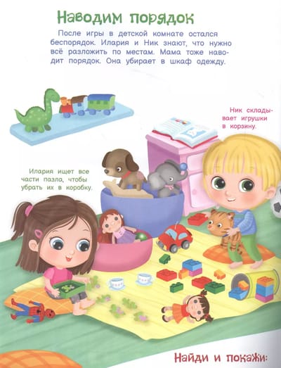 In each section, the child will find a "find and show" task that will help develop the child's attentiveness, and in the middle of the book there is an insert with stickers. Stickers will turn reading into an exciting game and will help develop fine motor skills.