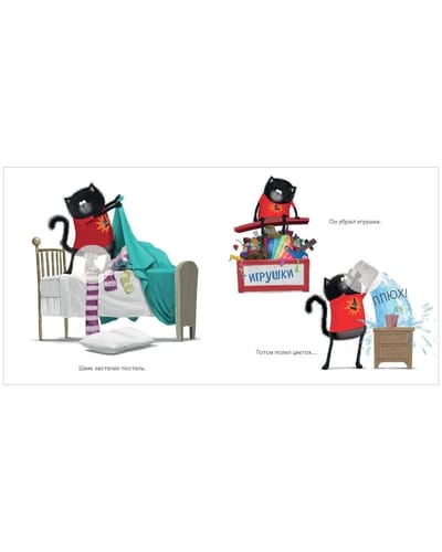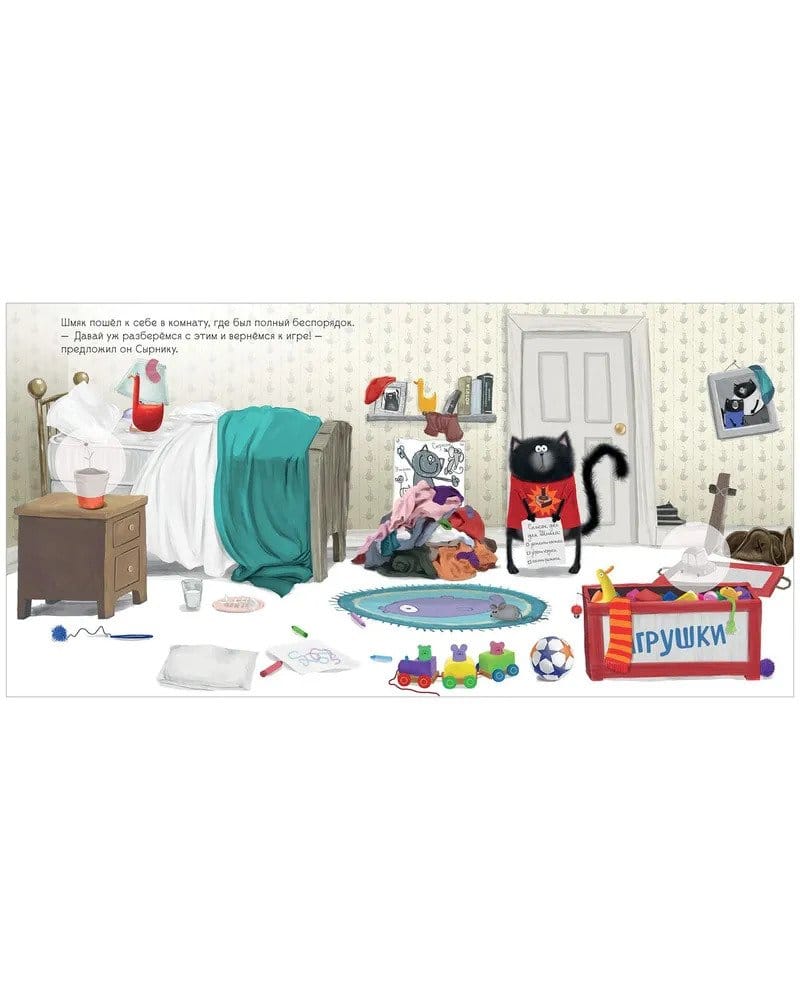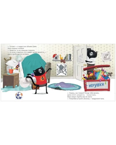 How to train your baby to help around the house? Kitten Shmyak's dad knows a secret! At the family council it was decided that now Shmyak will have his own list of household chores. But... Putting away toys, making the bed, watering the flowers - it will take forever! "When you're having fun, time flies by," Dad prompts Shmyak. Putting the toys in the drawer, Shmyak imagined that he had found a pirate's treasure on a desert island, and now he had to put all the gold coins in the chest. Who knew cleaning could be so much fun! All kids love stickers, so we've added 20 stickers for the kid to place on the pages of the book. Read, spend time together and have fun!