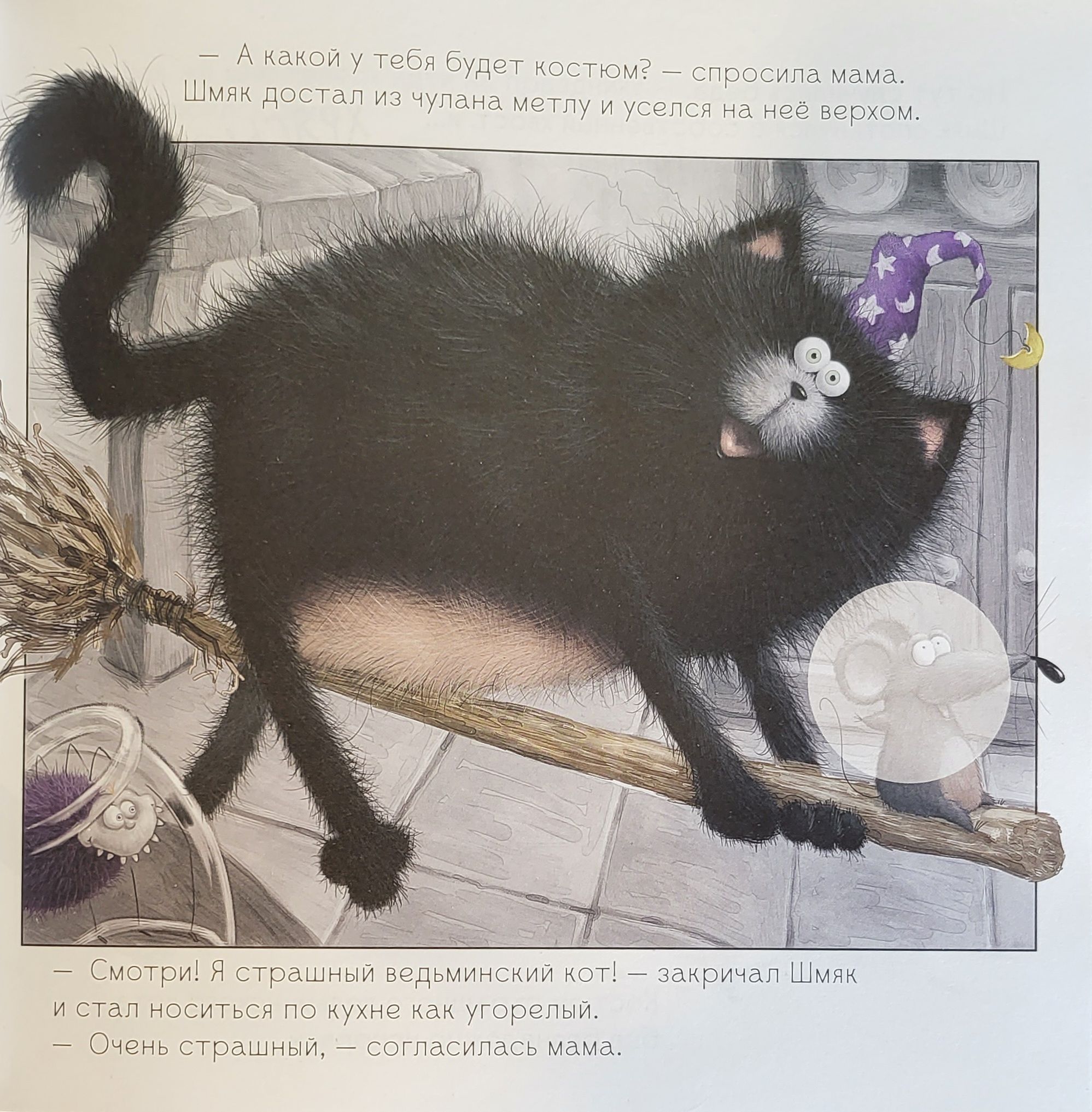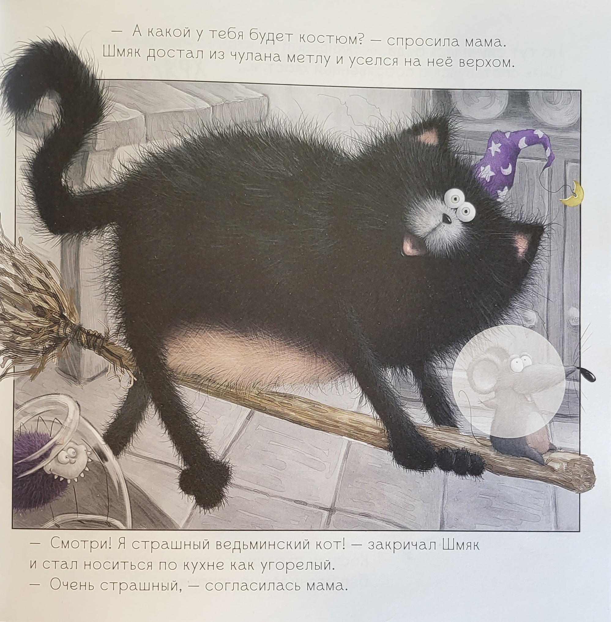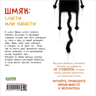 In Shmyak's class, the kittens are getting ready to celebrate Halloween. The program includes scary stories by the light of pumpkin lanterns and a prize for the most frightening image. Shmyak really wants to win the contest, but he doesn't know how.... After all, he himself is afraid of even a small spider, his broom is broken, and his masquerade costume causes laughter. Suddenly, during the telling of horror stories, a real commotion started, and when Mrs. Puhliss turned on the light...All children love stickers, so we have added 20 stickers that the kid has to place on the pages of the book.