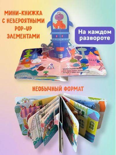 Would you like to fly into space on a real rocket? Meet friendly aliens? Or perhaps walk on the moon? Then get ready for a space journey! Each page of this book features three-dimensional elements and pop-up panoramas. Play with the moving parts and develop fine motor skills! Plus, learn interesting facts about space in this interactive book for little ones.