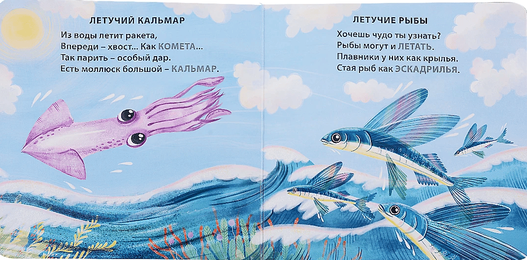 The informative book-cardboard “Who flies” in the poems of Evgeny Sosnovsky will quickly and easily introduce the baby to the unusual flying inhabitants of our planet Earth. The child learns that not only birds and insects can fly, but also some animals, even fish and squid.