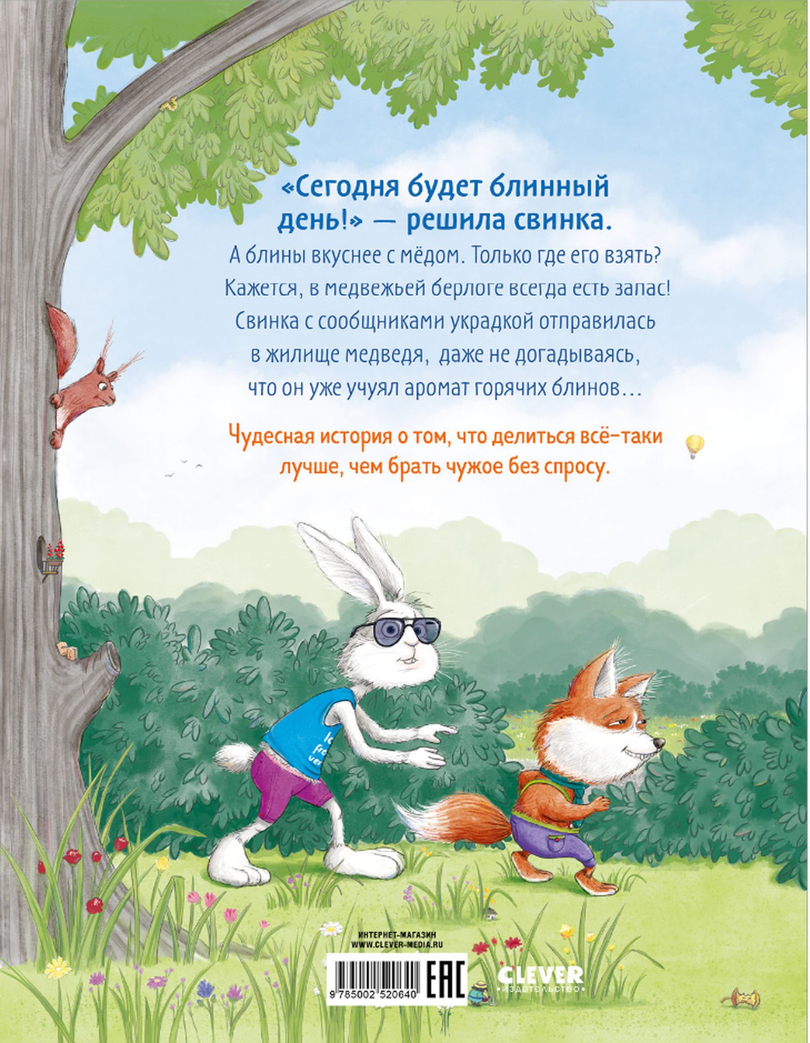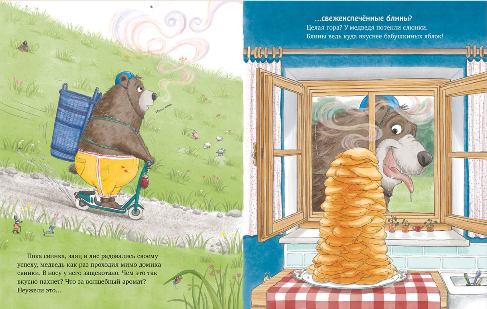 The pig baked pancakes and decided to take some honey from the bear... without asking the owner. And the bear decided to steal the pancakes from the pig. On the way, the thieving friends met! What happened next? Fortunately, everything ended well! Be sure to discuss with your children how important it is to ask permission when you want to borrow something from friends.