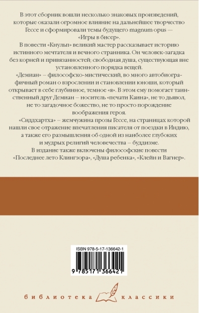 This collection includes several landmark works that had a great influence on Hesse's later work and formed the themes of the future magnum opus - "The Bead Game". In the story "Knulp" the great master tells the story of a true dreamer and eternal wanderer. He is a man of mystery without roots and attachments; a free soul, existing outside the established order of things. "Demian" - philosophical and mystical, largely autobiographical novel about growing up and becoming a young man who discovers the deep, dark "I" in himself. In this he is helped by a mysterious friend Demian - the bearer of the "seal of Cain", not the devil, not a mysterious deity, not just a creature of the hero's imagination. "Siddhartha" - a pearl of prose Hesse, on the pages of which were reflected in the impressions of the writer's trip to India, as well as his thoughts on one of the deepest and wisest religions of mankind - Buddhism. The edition also includes philosophical stories "The Last Summer of Klingzor", "The Soul of a Child", "Klein and Wagner".