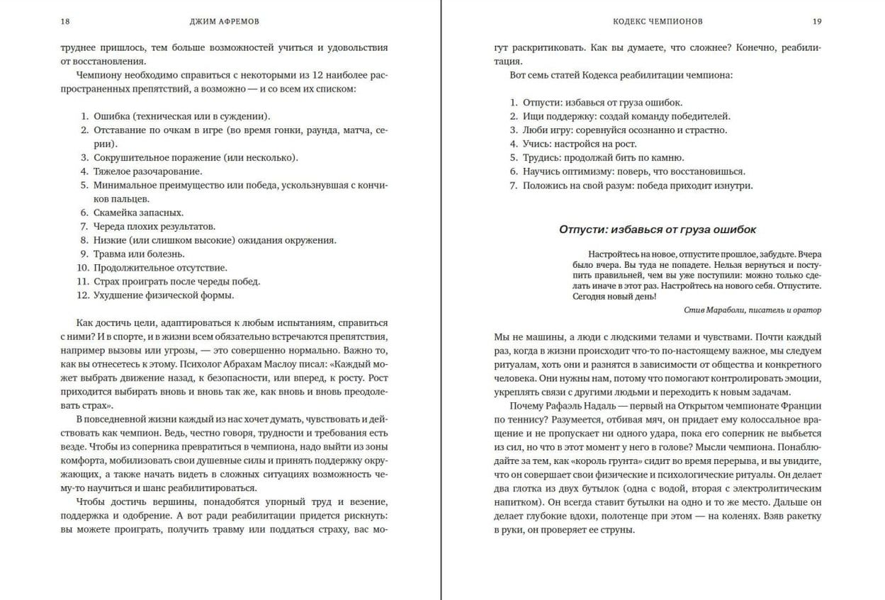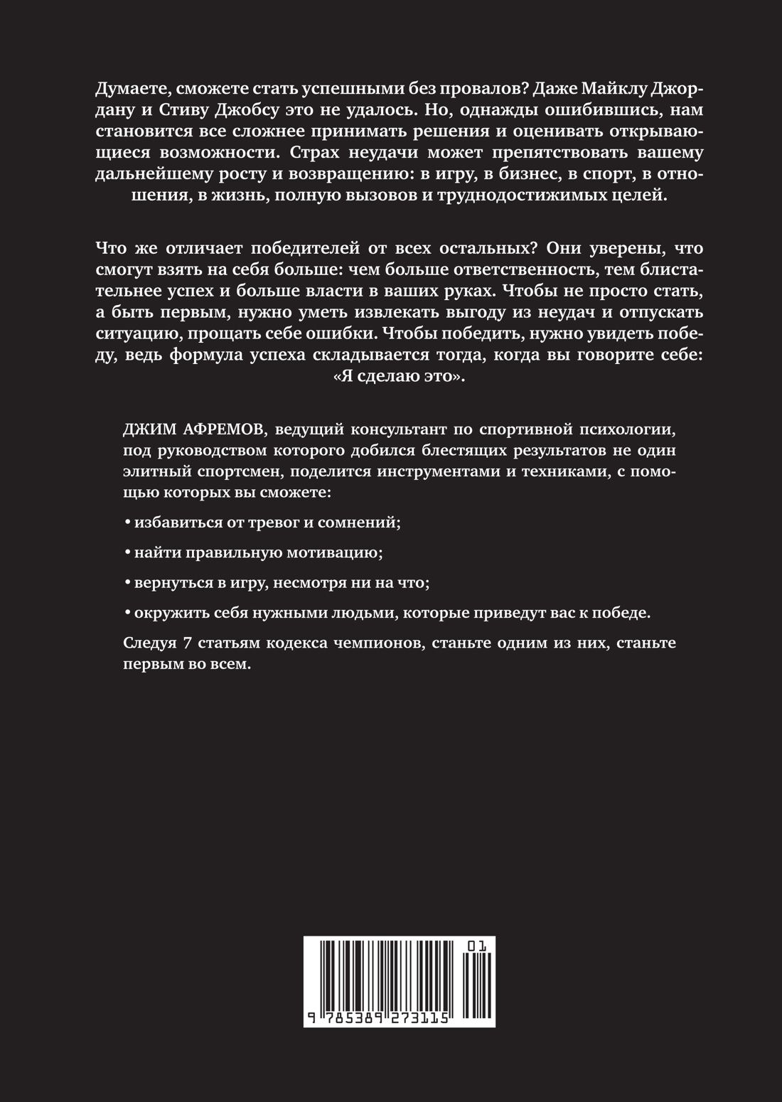The ability to return to the field, court or business after a bad streak and achieve success again is not only about talent and physical abilities. Here, the most important thing is the way of thinking and mental attitude. Leading sports psychologist Jim Afremov, author of the bestseller "The Mind of Champions", knows what makes good players great - both in sports and in business, career and creativity. On the pages of this book, he presents carefully verified step-by-step strategies for athletes and non-athletes of any age and skill level that help to recover from a loss, overcome the effects of injury (as well as the fear of re-injury), cultivate deep calm confidence, prepare for competitions and other decisive events. Thanks to practical comments and advice, autogenic training methods and motivating stories of real heroes of big sports, "The Return of Champions" is a practical guide for anyone who wants to get back in the game and win.