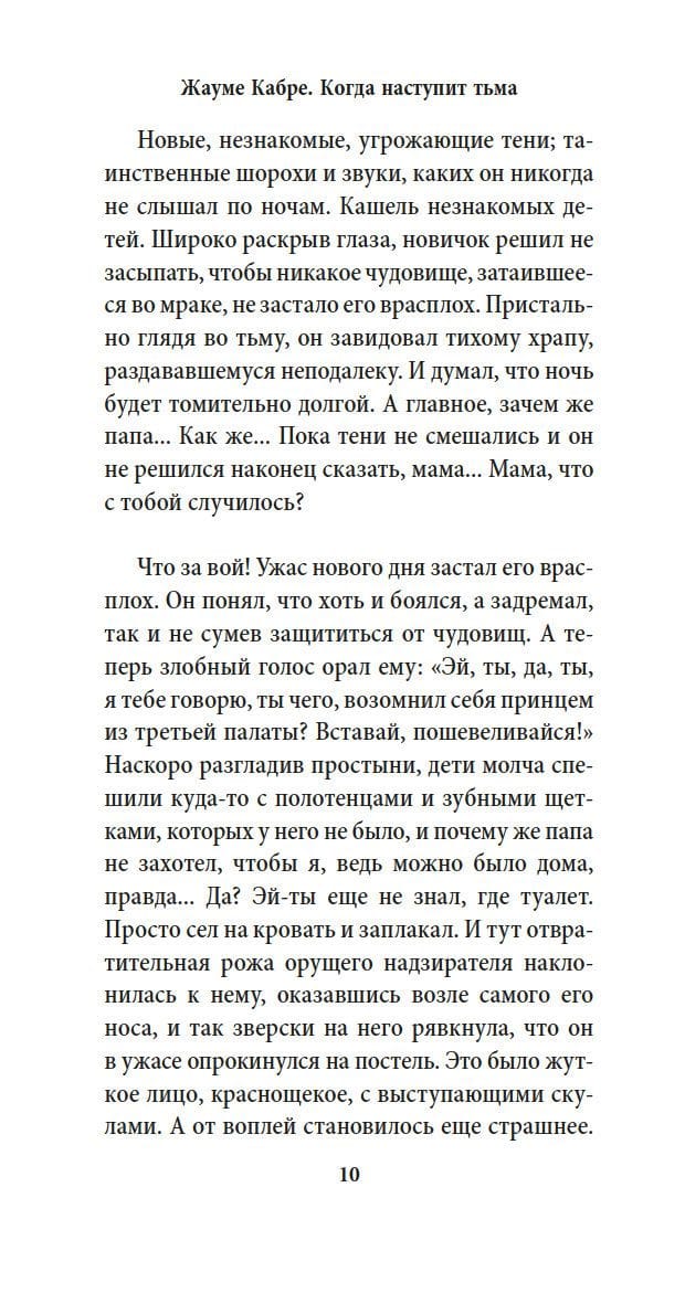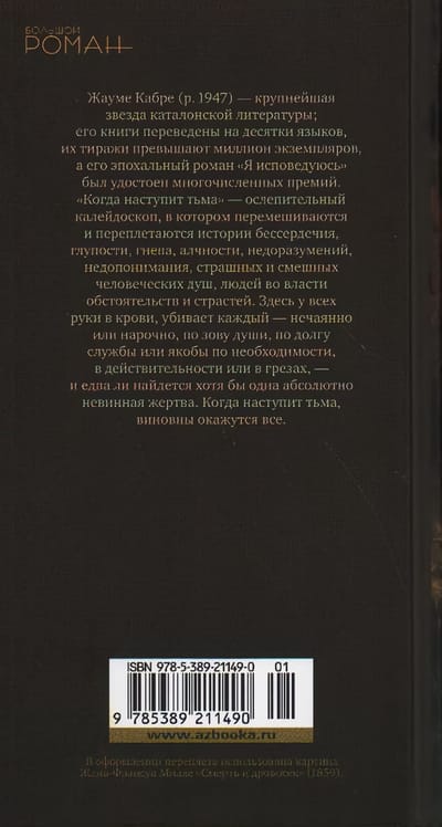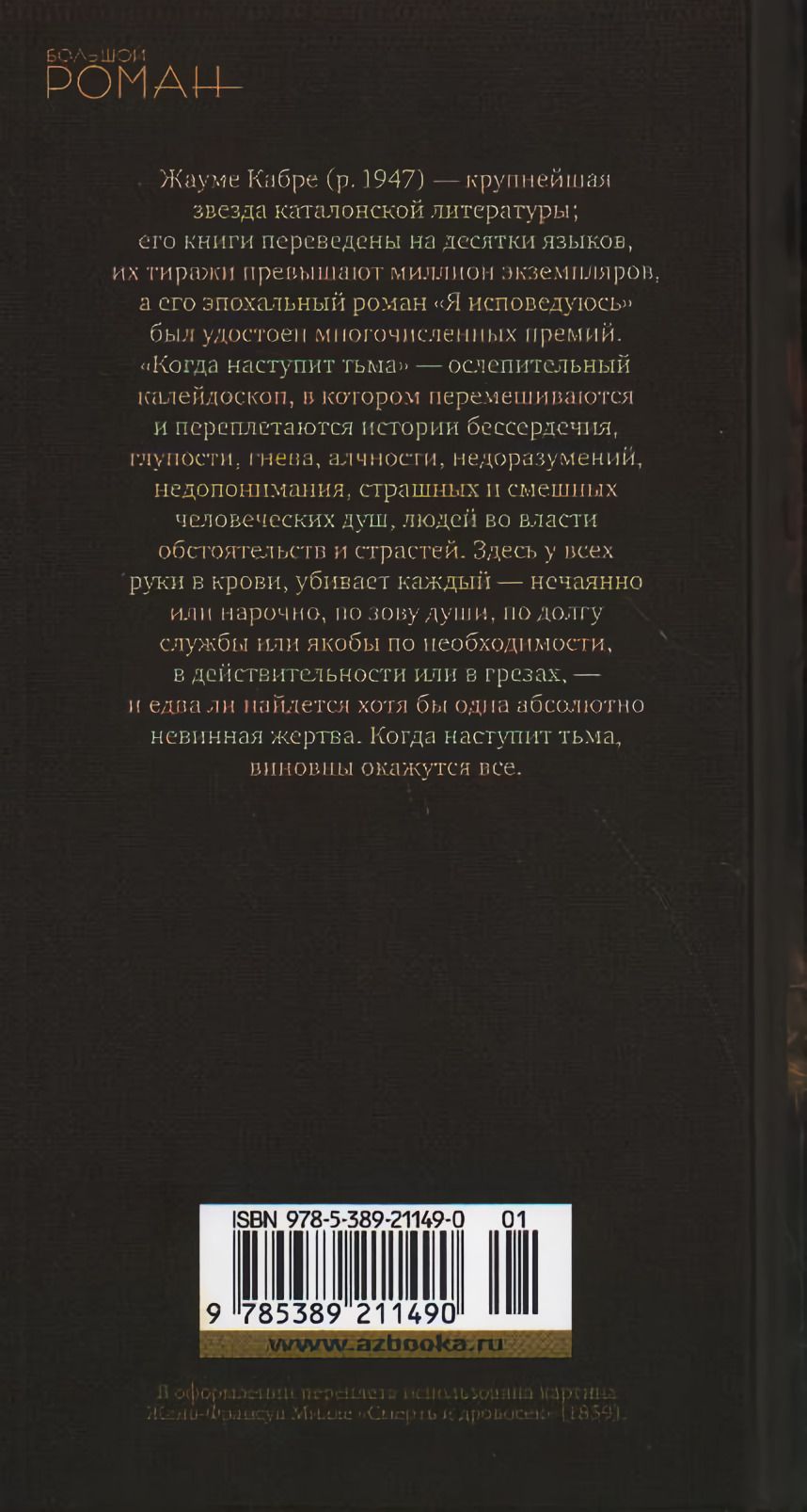 One orphanage pupil grows up to take revenge on everyone who abandoned him. One sophisticated thief is stolen by a painting he stole. One book looks off the shelf as one would-be Nobel laureate goes mad on the day of his long-awaited triumph. One writer composes a novel and threatens his publisher with suicide if the book is not printed. One former soldier, having already completely lost his mind, still cannot forget the lost battle and death of his comrades on the battlefield..... Jaume Cabré (b. 1947) is the biggest star of Catalan literature; his books have been translated into dozens of languages, their circulation exceeds one million copies, and his epochal novel "I Confess" was awarded numerous prizes. "When the Darkness Comes" - a dazzling kaleidoscope, which mixes and intertwines stories of callousness, stupidity, anger, greed, misunderstandings, misunderstandings, terrible and funny human souls, people at the mercy of circumstances and passions. Here everyone's hands are bloody, everyone kills - unintentionally or on purpose, at the call of the soul, out of duty or supposed necessity, in reality or in dreams - and there is hardly a single completely innocent victim. When darkness falls, everyone will be guilty.